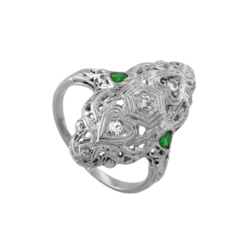 $7,250.00 USDPlatinum Antique 1 Carat Total Weight Diamond Ring With Synthetic Green Emeralds