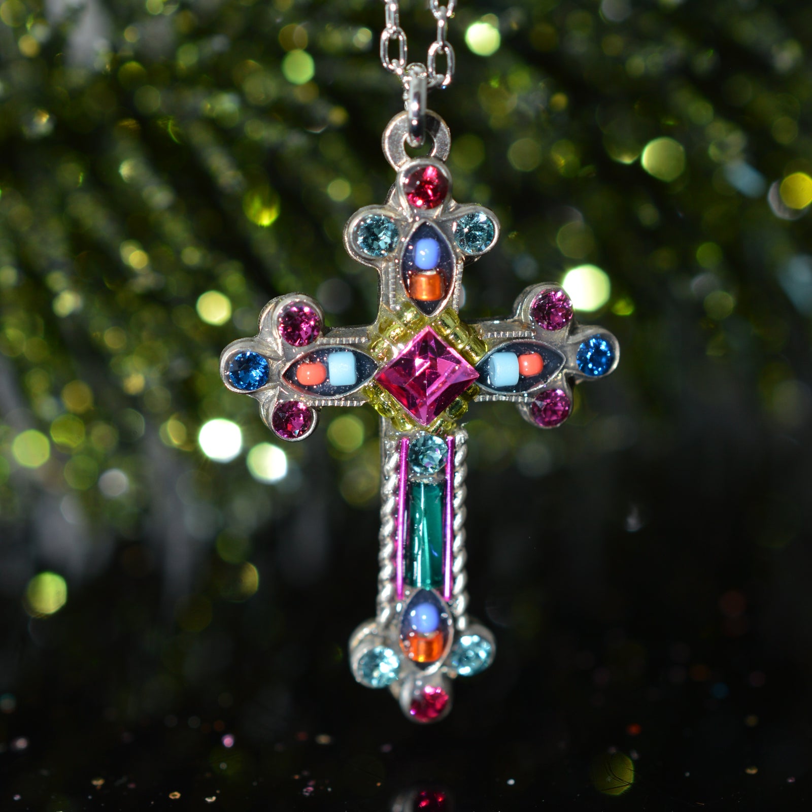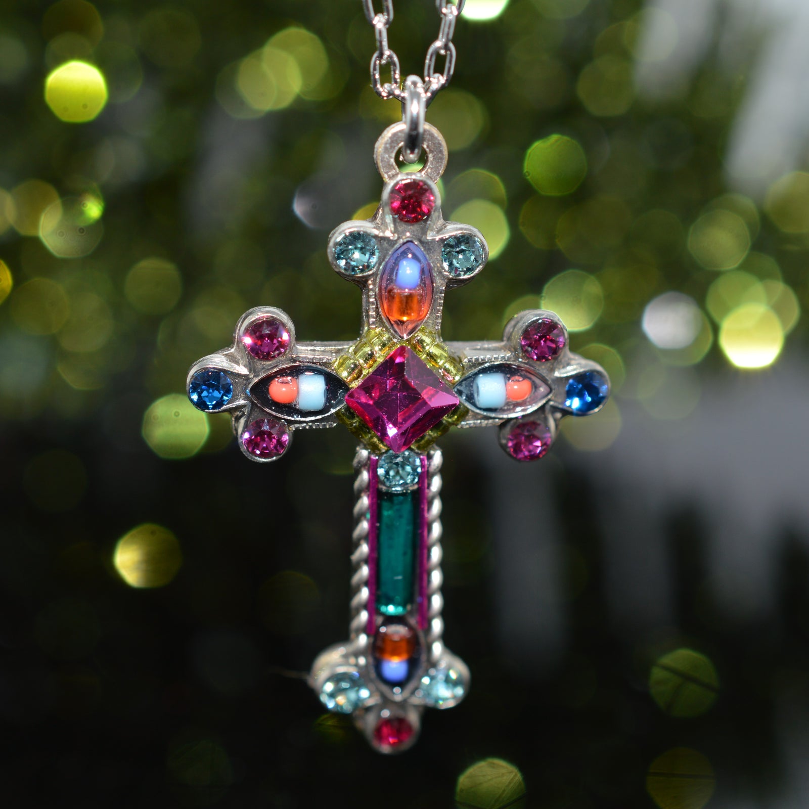 $58.00 USDAntique Silver Plated Large Multi-Colored Crystal Cross Pendant by Firefly