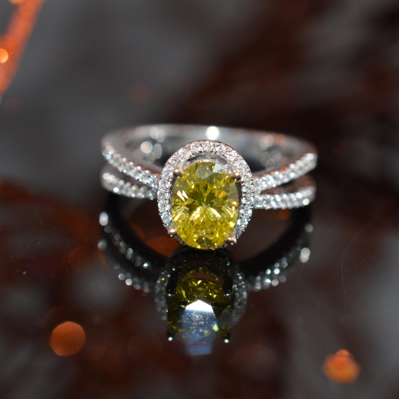 $5,000.00 USD18K White Gold 1.17 Carat Irradiated Yellow Oval Diamond ring