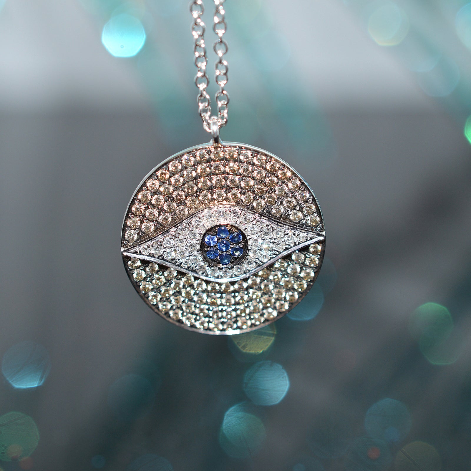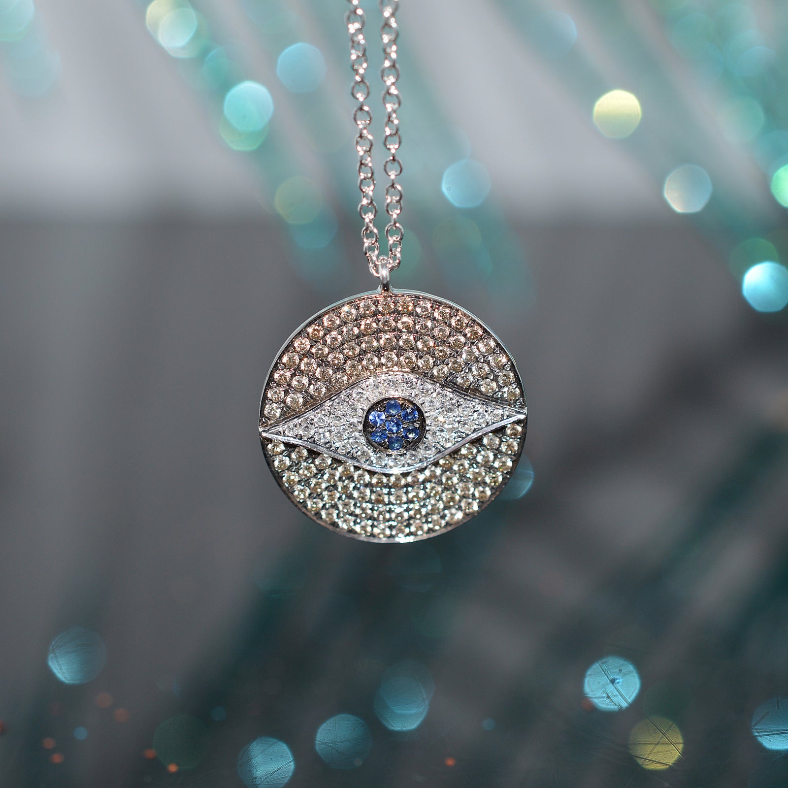 $1,650.00 USD14K White Gold Diamond & Sapphire Round Evil Eye Pendant With Chain