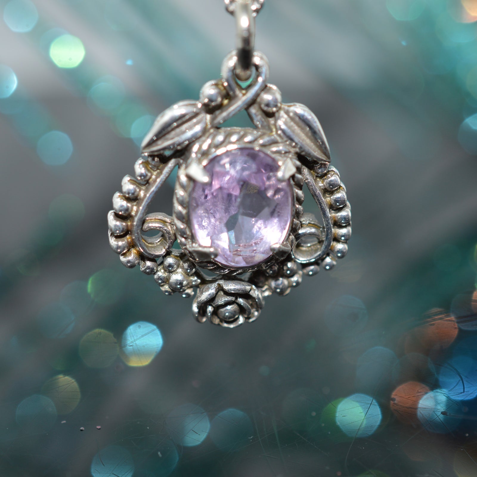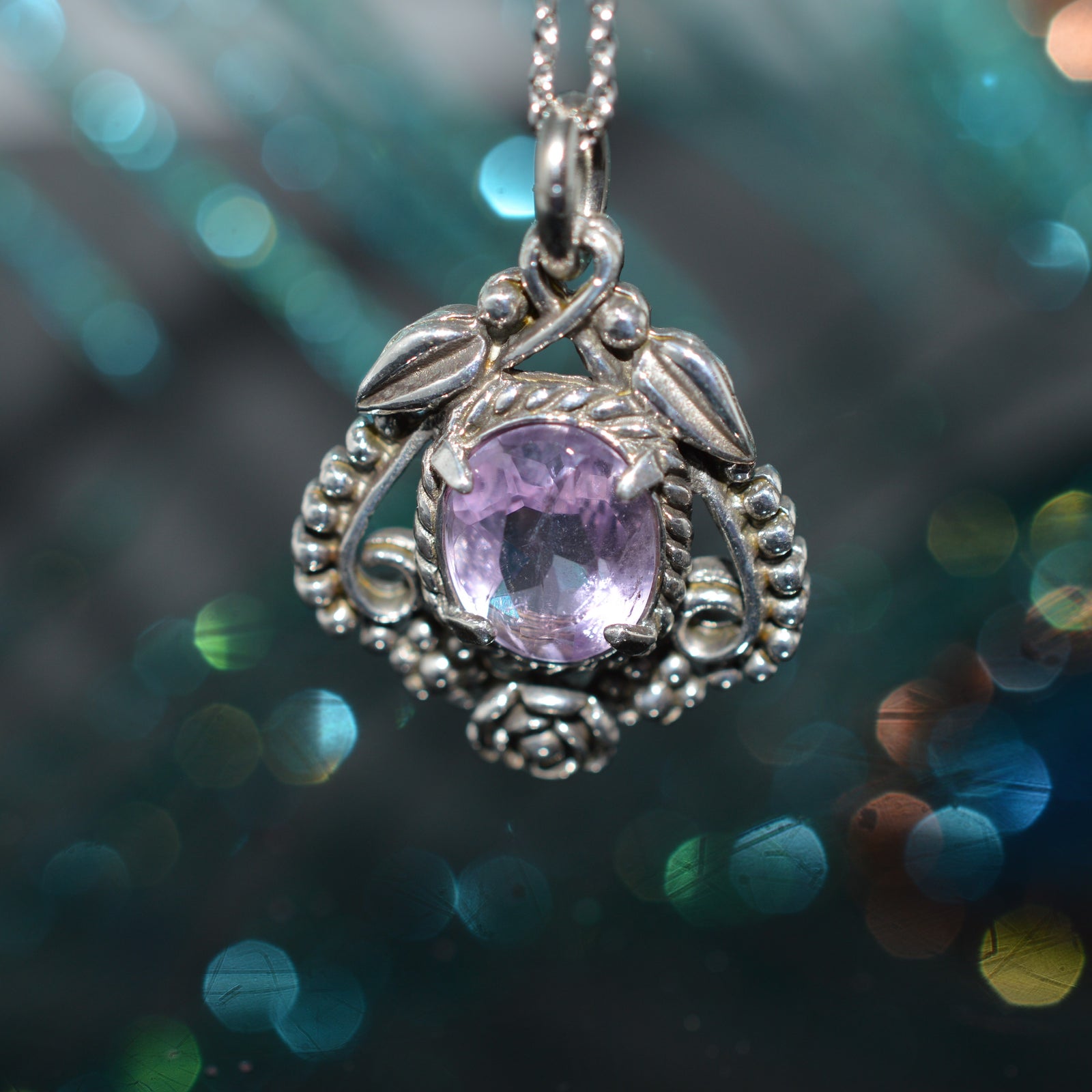 $150.00 USDSterling Silver 18 Inch Long Chain With Amethyst Pendant Containing Leaves & Berries