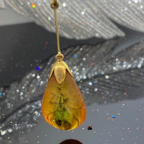 $295.00 USD18K Yellow Gold 24 Inch Long Necklace With Victorian Amber Pendant Containing Beetle