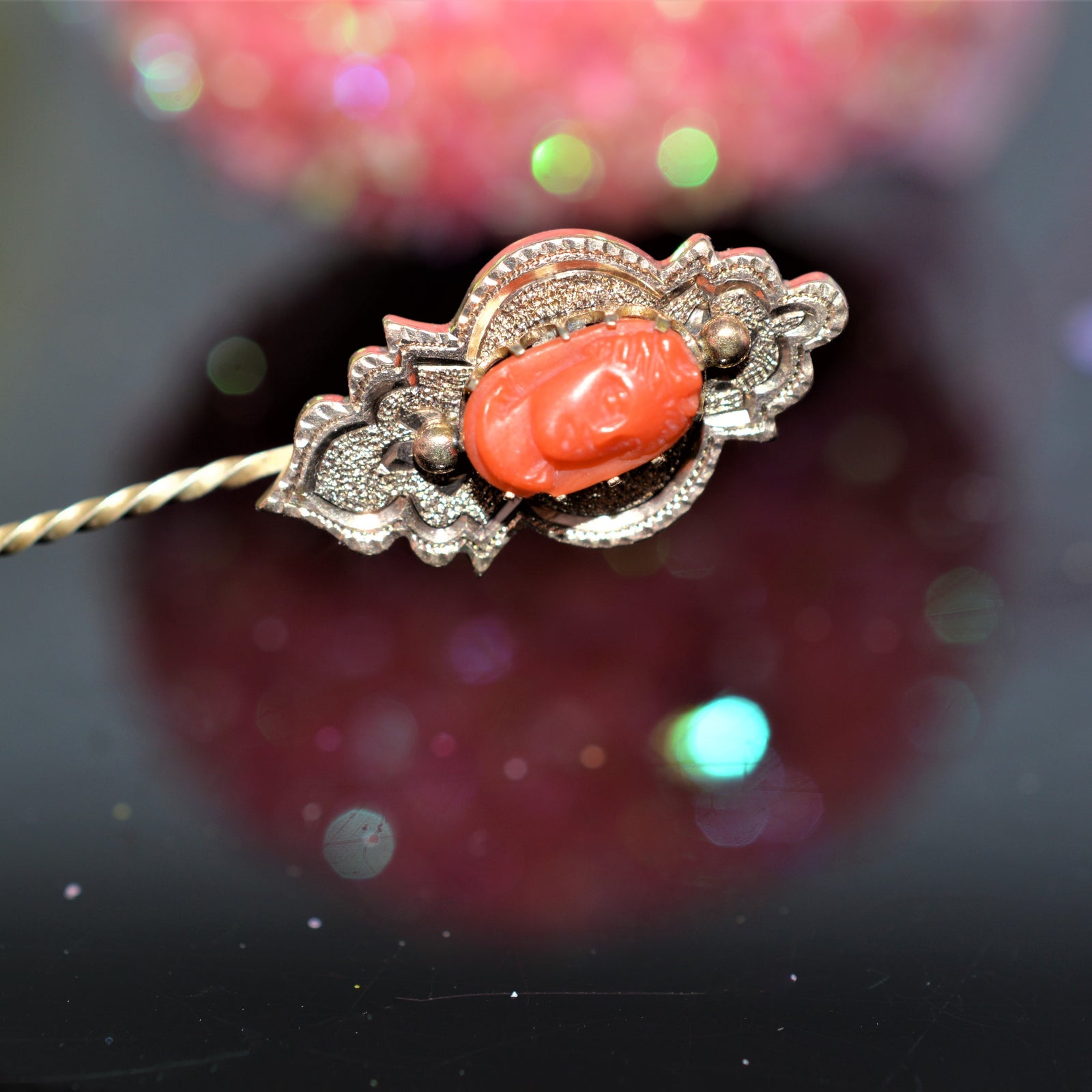 $445.00 USD10K Yellow Gold Oval Coral Cameo Stick Pin