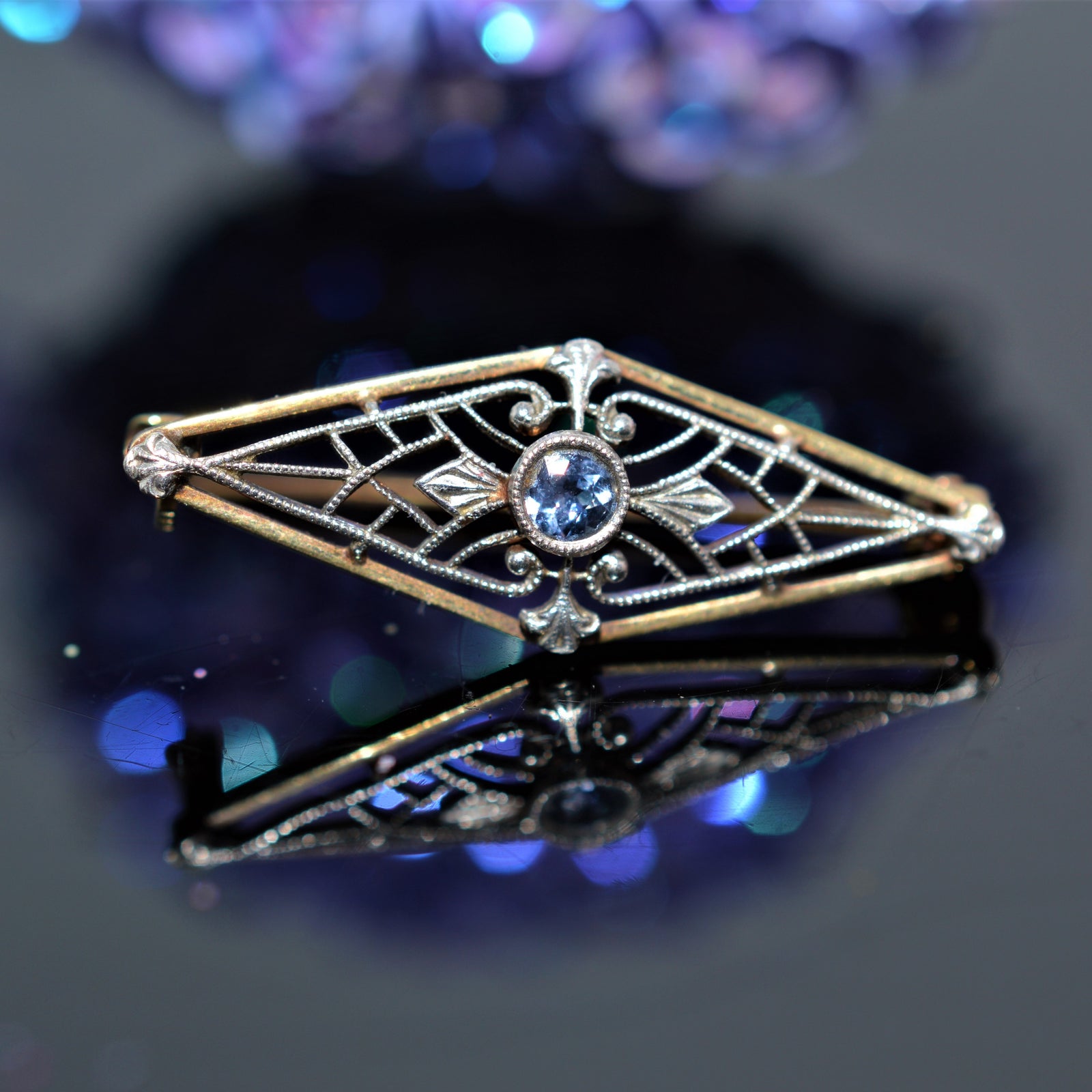 $315.00 USD14K Two Tone Antique Round Blue Sapphire Brooch