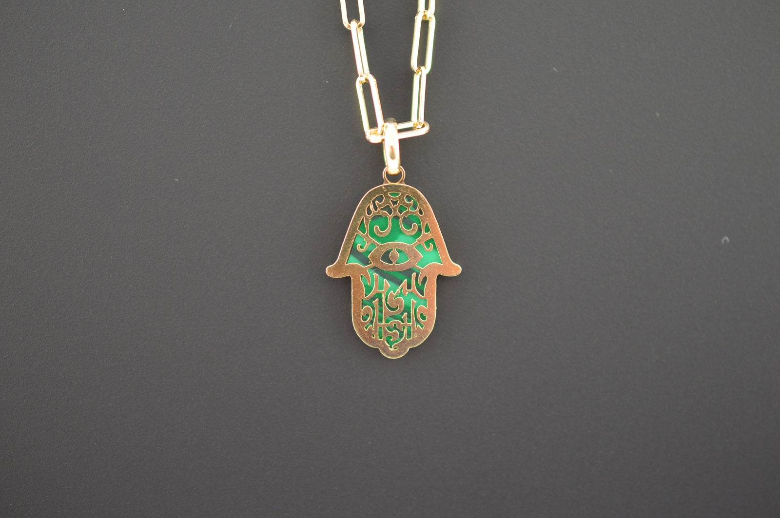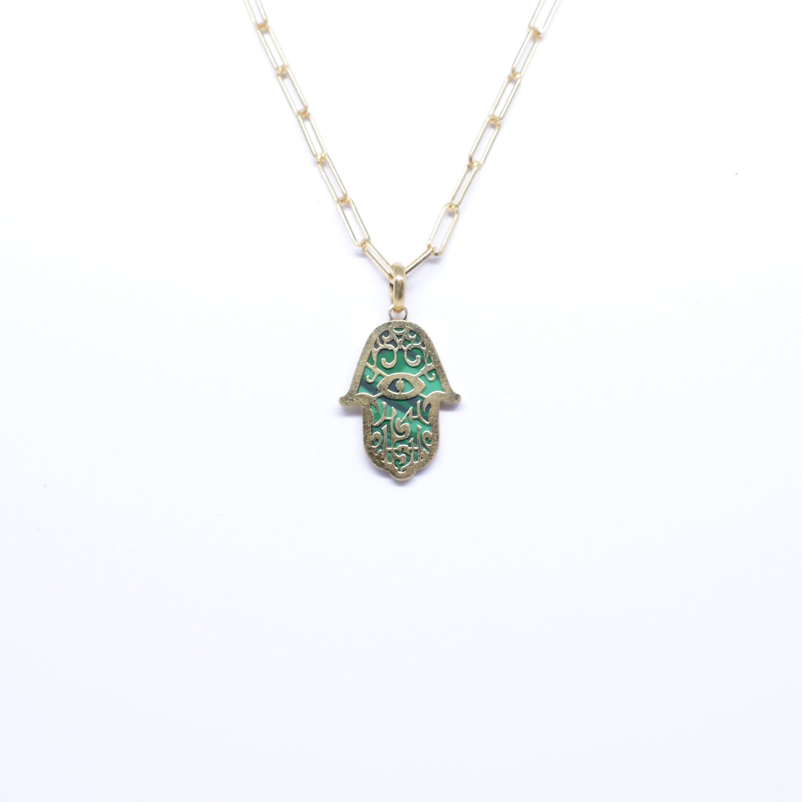 $700.00 USD14K Yellow Gold and Malachite Hand Of Fatima Necklace