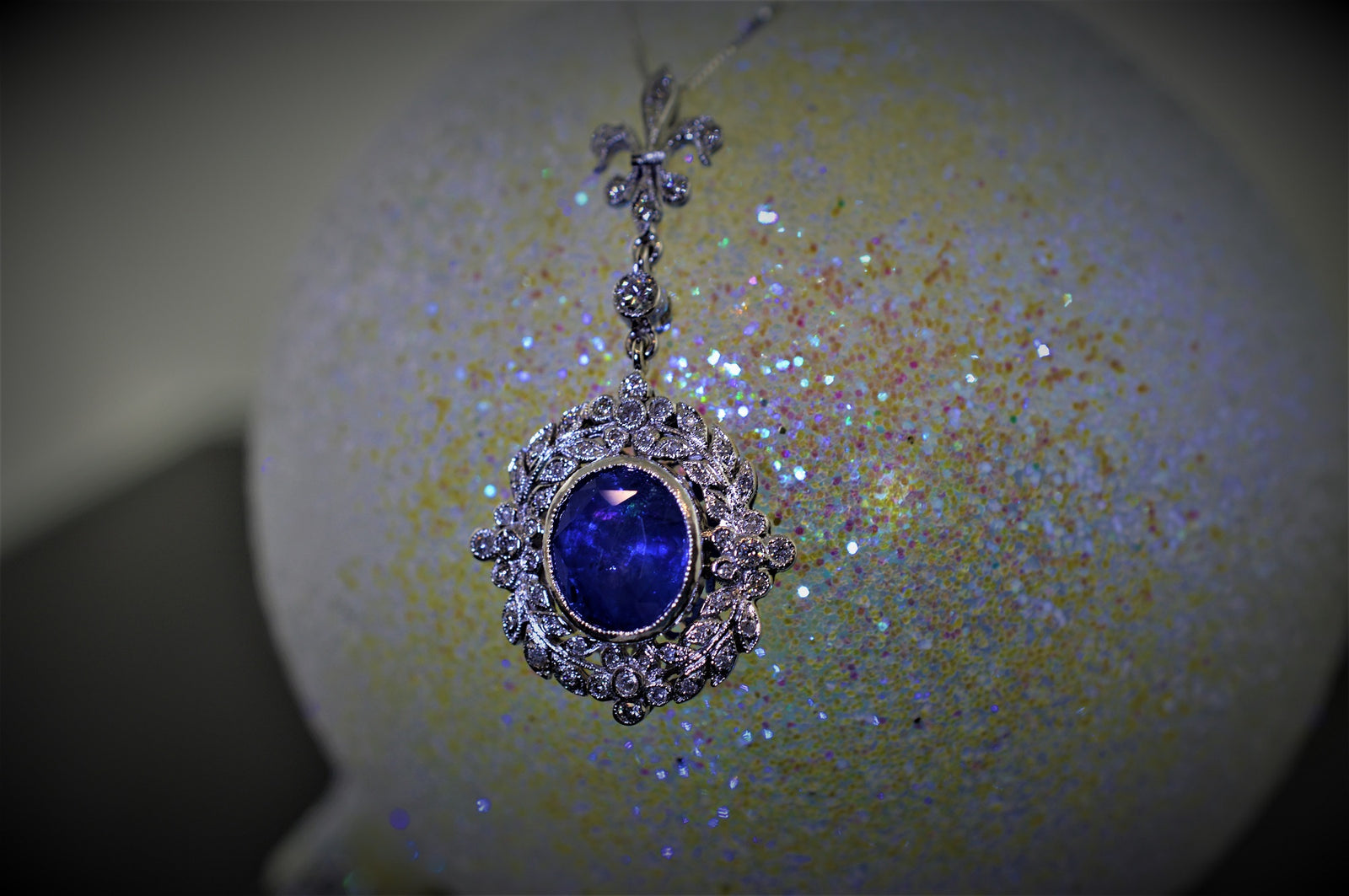 $8,950.00 USD18K White Gold Diamond and Oval Sapphire Necklace, 18" Chain