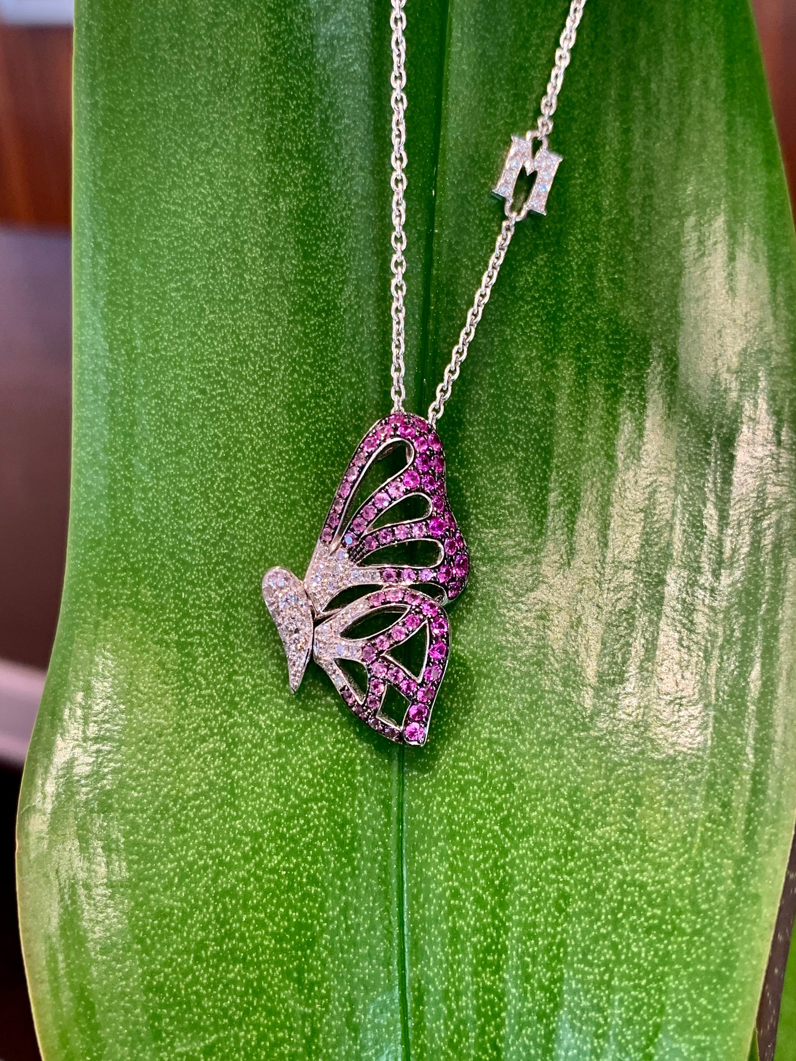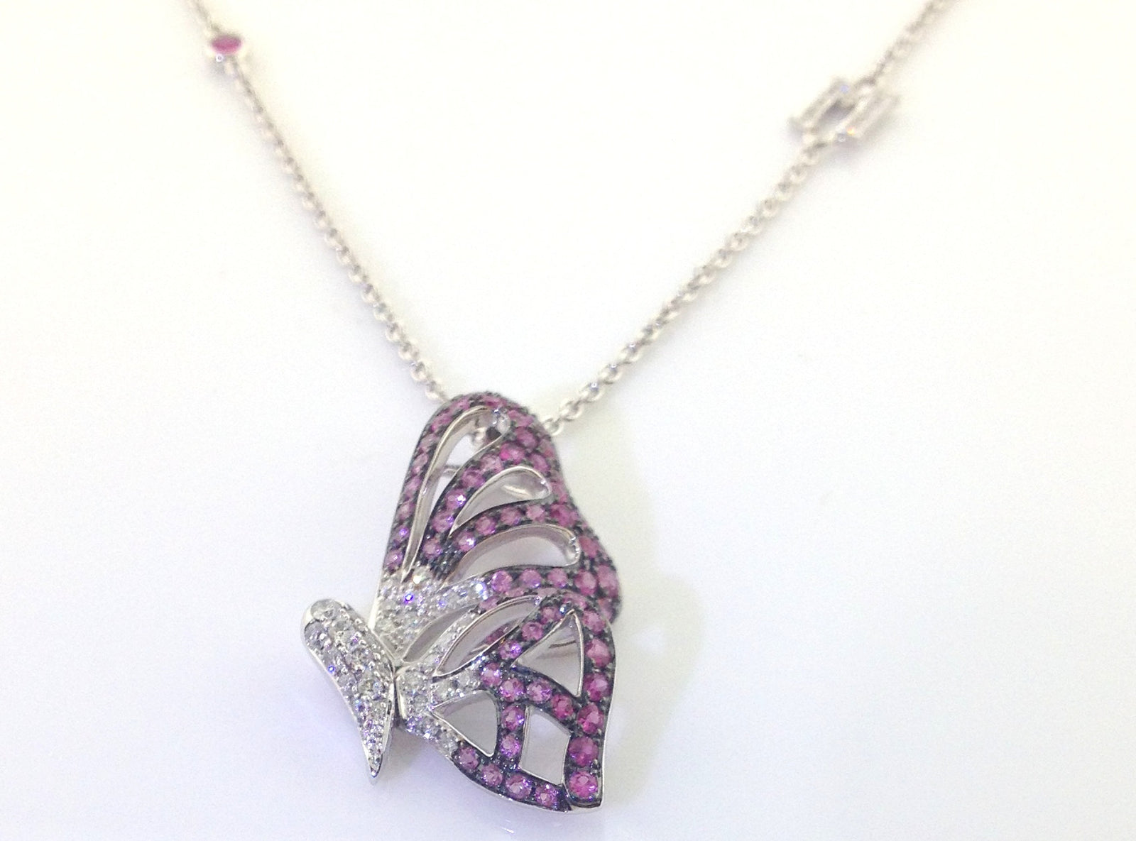 $1,095.00 USD18k White Gold Diamond And Pink Sapphire Butterfly Necklace