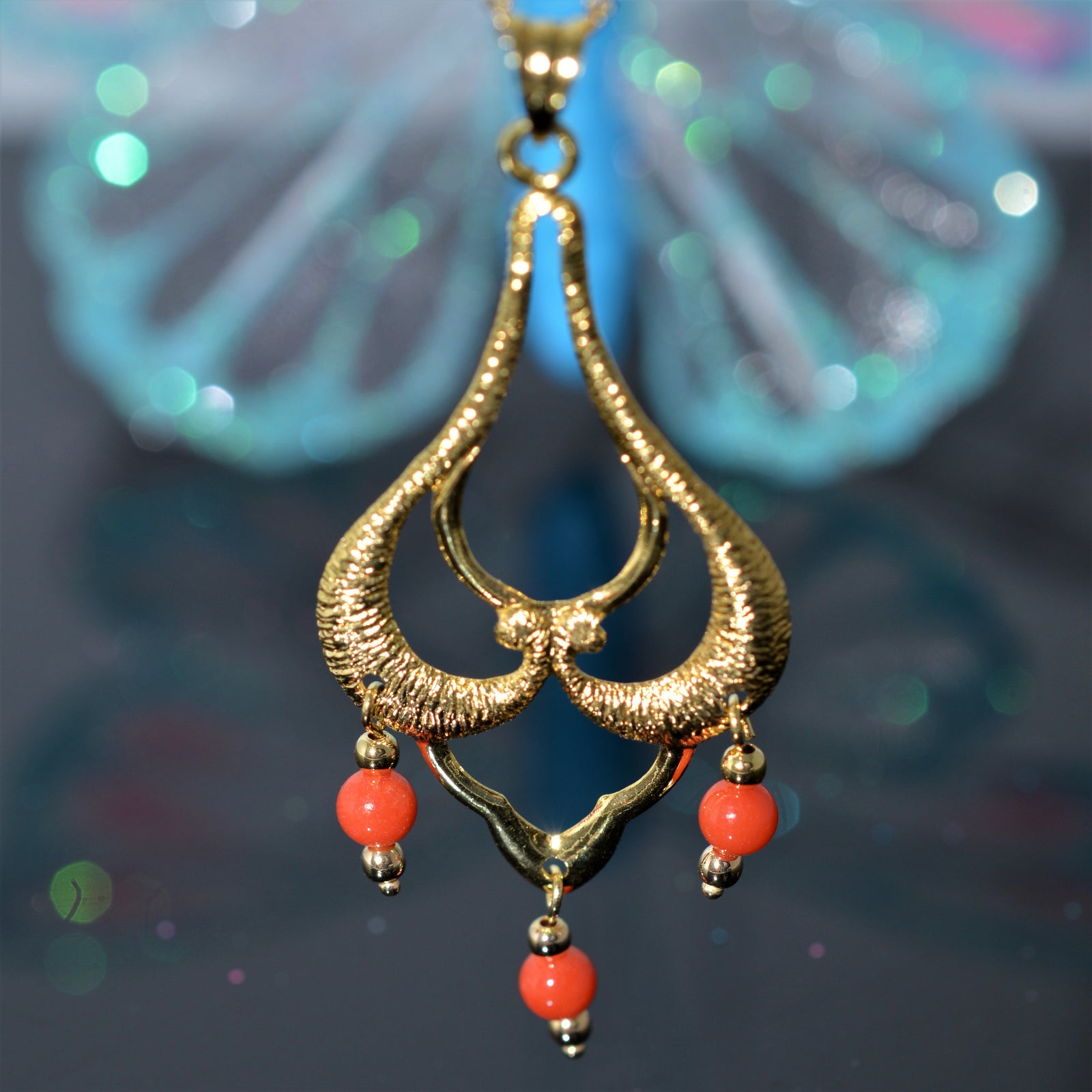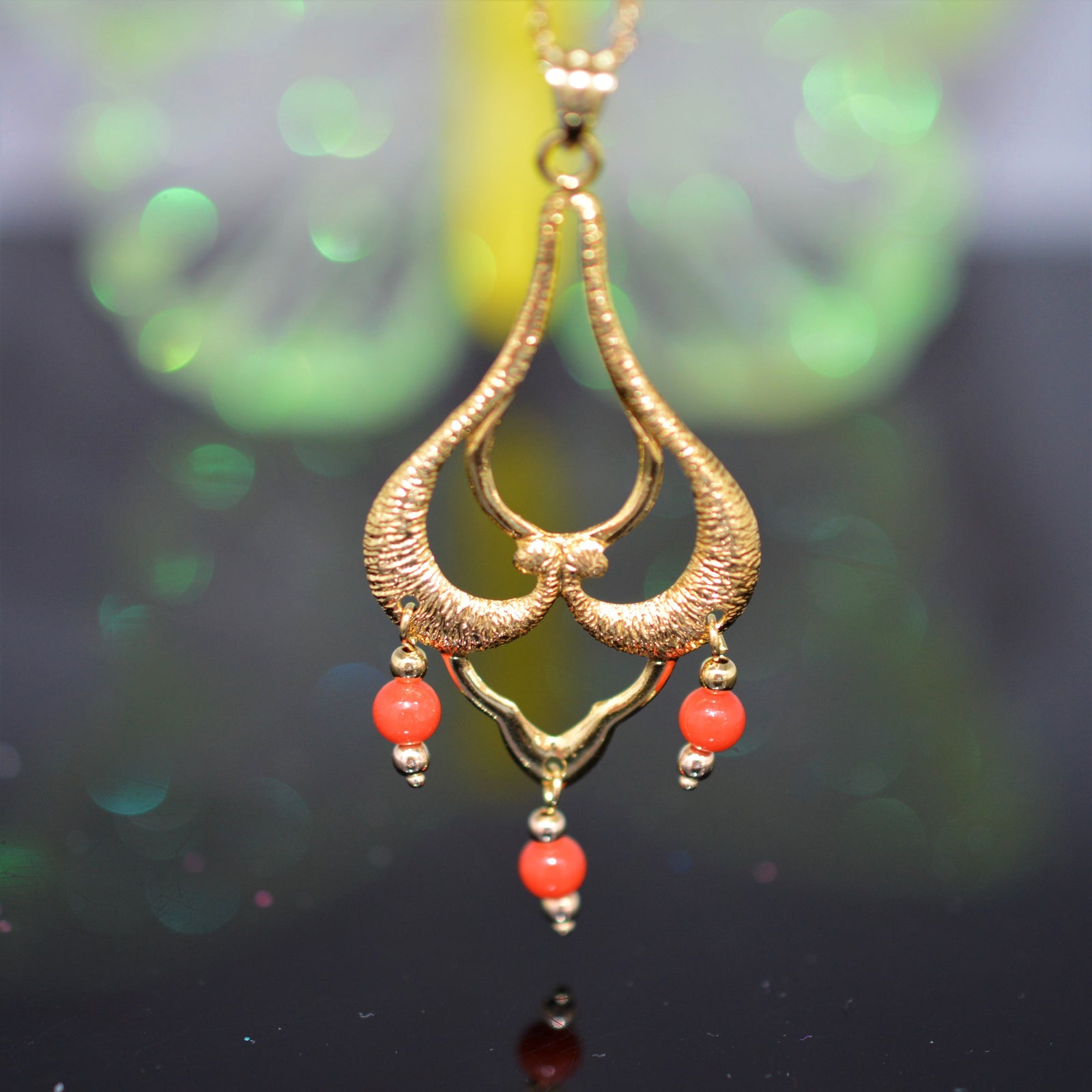 18K Yellow Gold Red Coral Dangle Bead Necklace