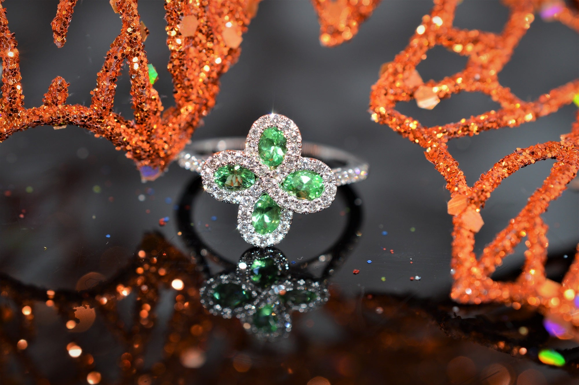 14K White Gold Oval Mint Garnet and Round Diamond Ring