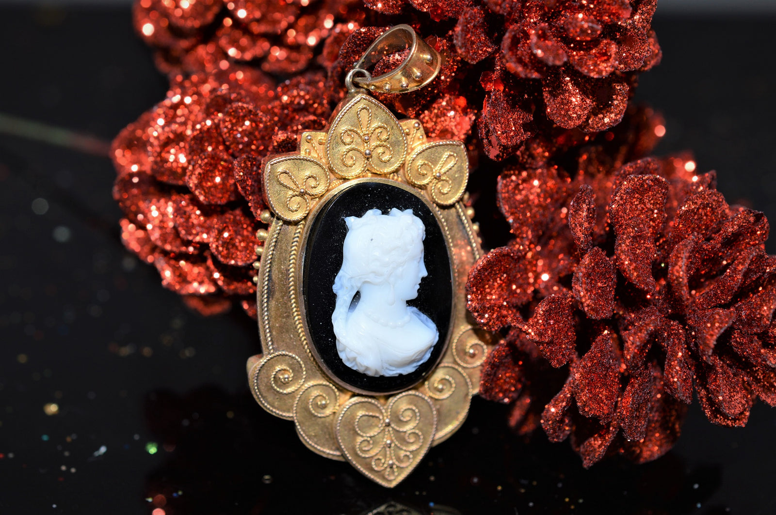 $4,550.00 USD14K Antique Black And White Agate Oval Cameo Pendant