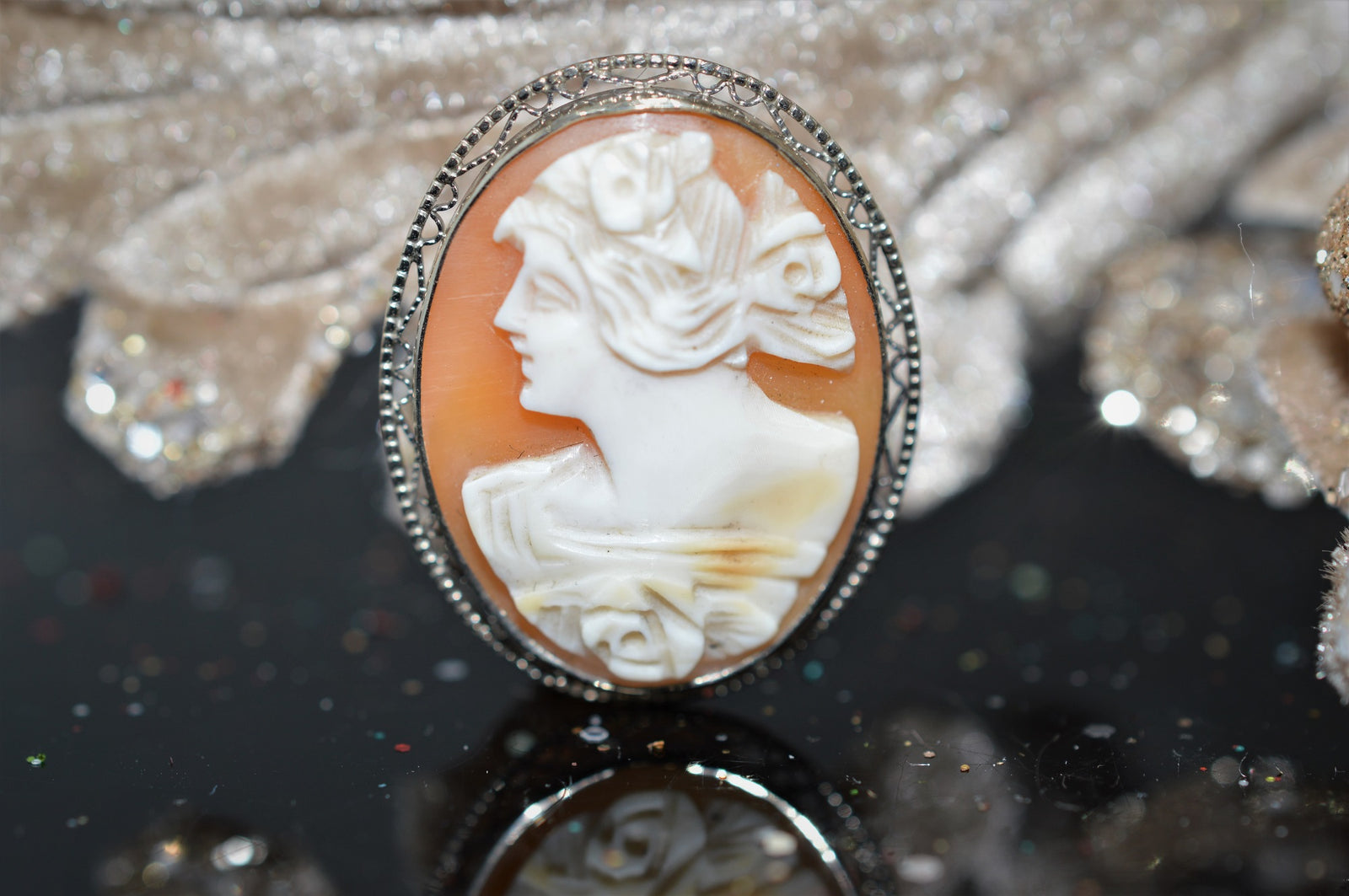 $395.00 USD14 Karat White Gold, Oval Shell Cameo Brooch with Fancy Lady
