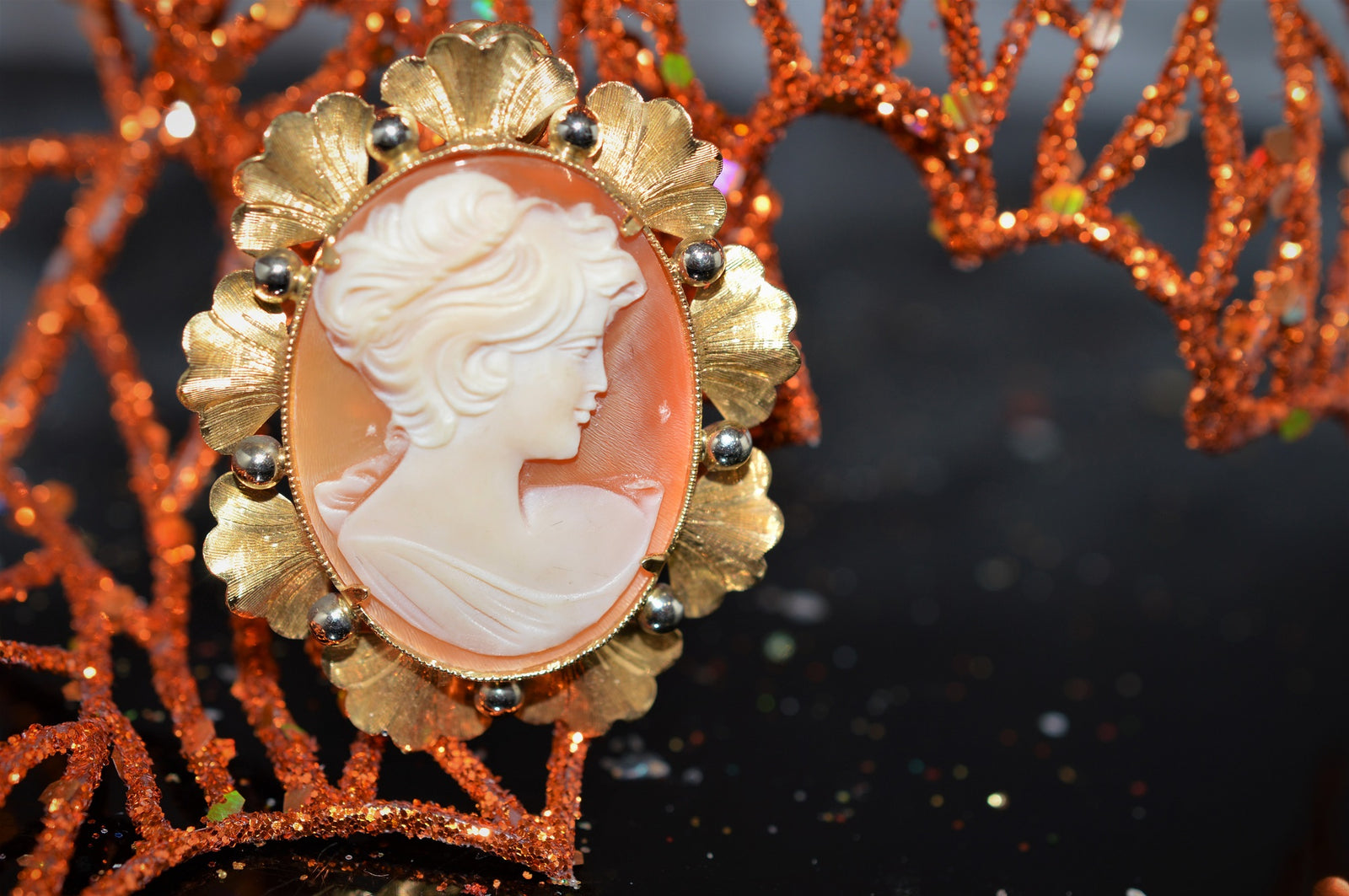 $850.00 USD10K Rose Gold Shell Cameo Brooch With Hand Engraved Border