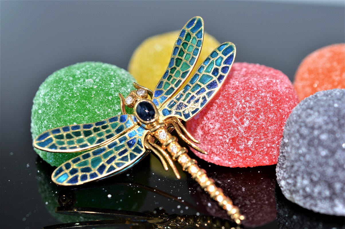 $450.00 USD18K Yellow Gold Blue And Green Handcrafted Dragonfly Brooch