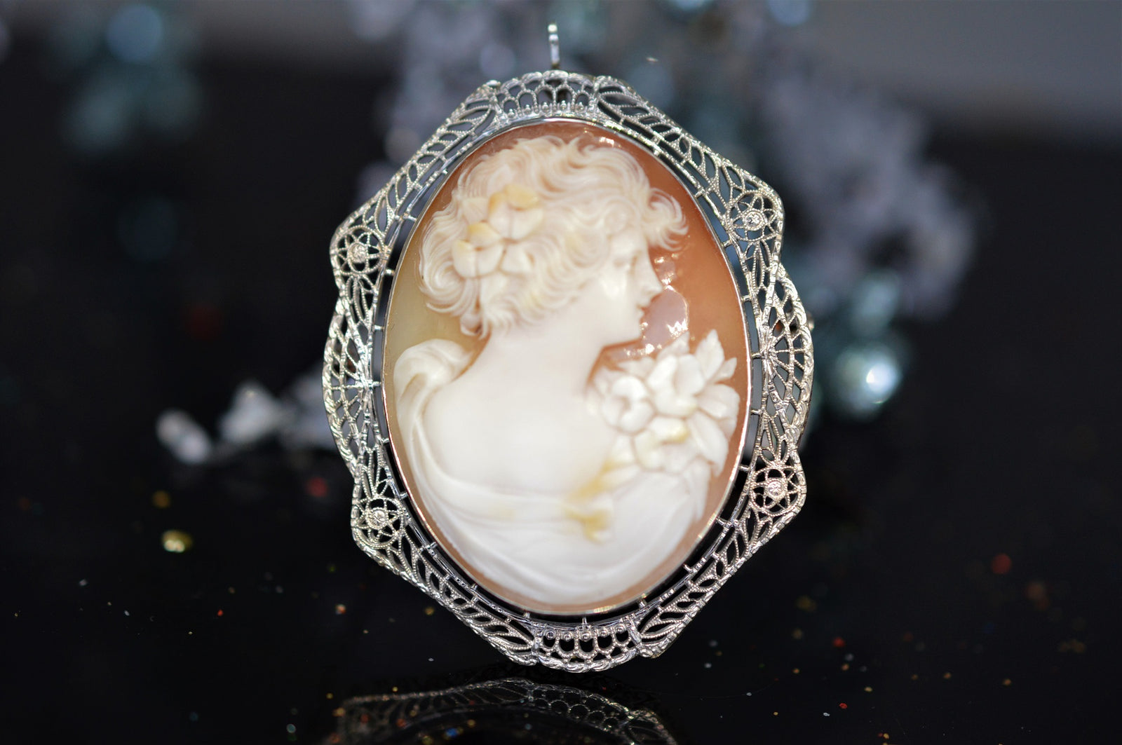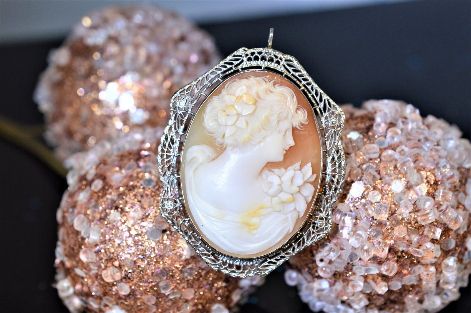 $1,750.00 USD14K White Gold Filigree Shell Cameo Pin and Pendant