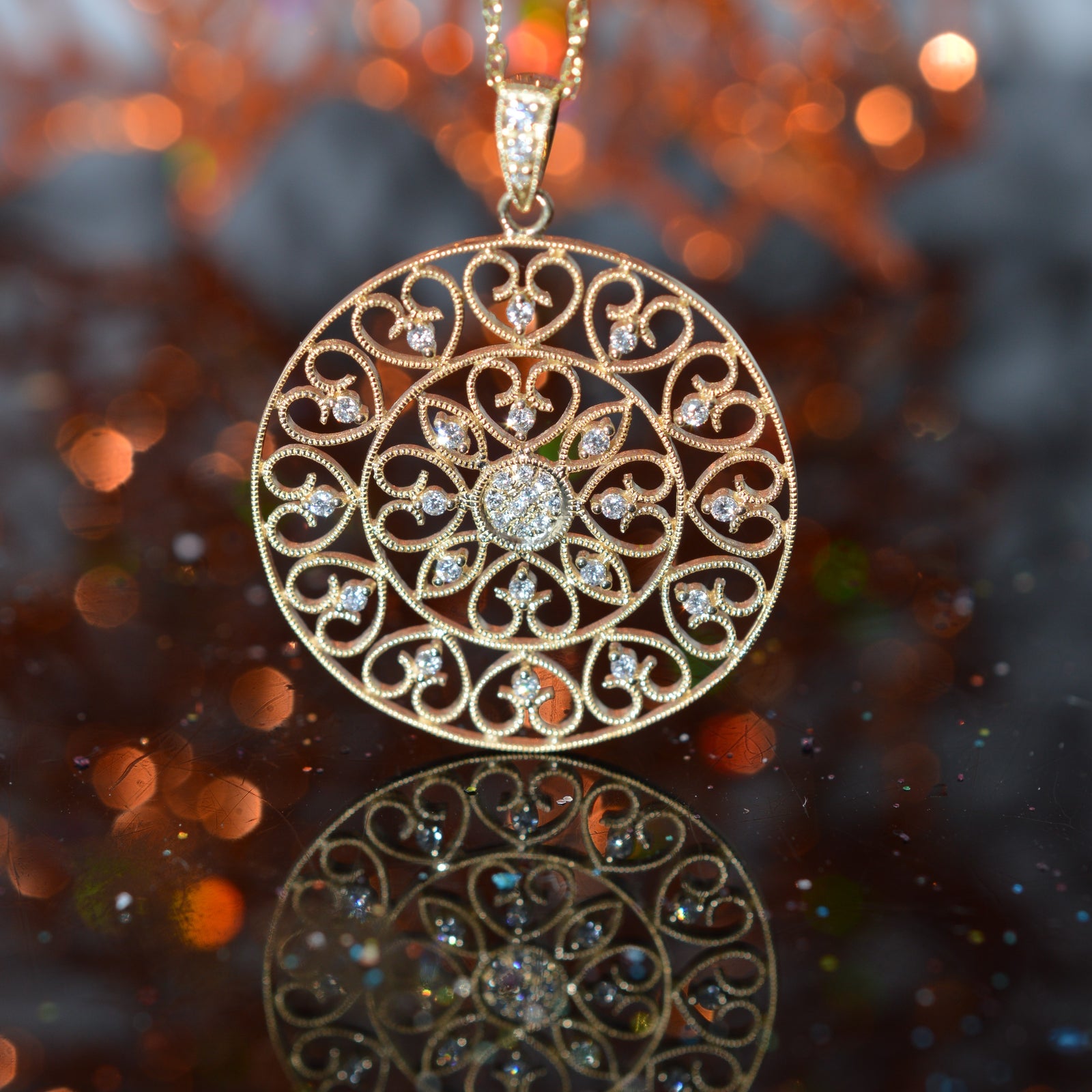 $1,800.00 USD14K Two Tone Gold and Diamond Filigree Pendant With 18 Inch Chain