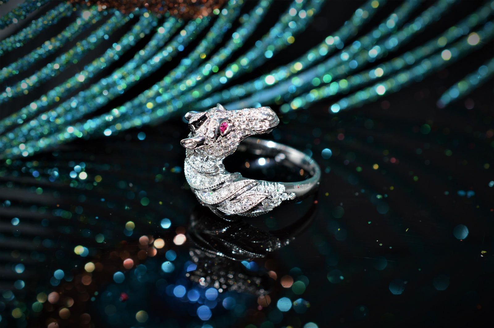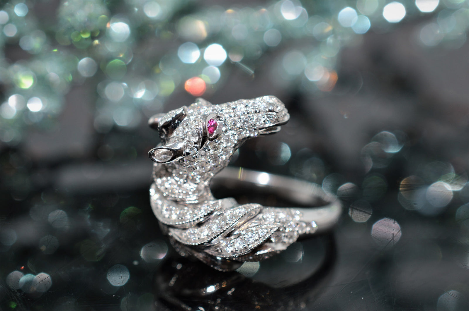 $4,300.00 USD18K White Gold Diamond Horse Ring with Ruby Accents