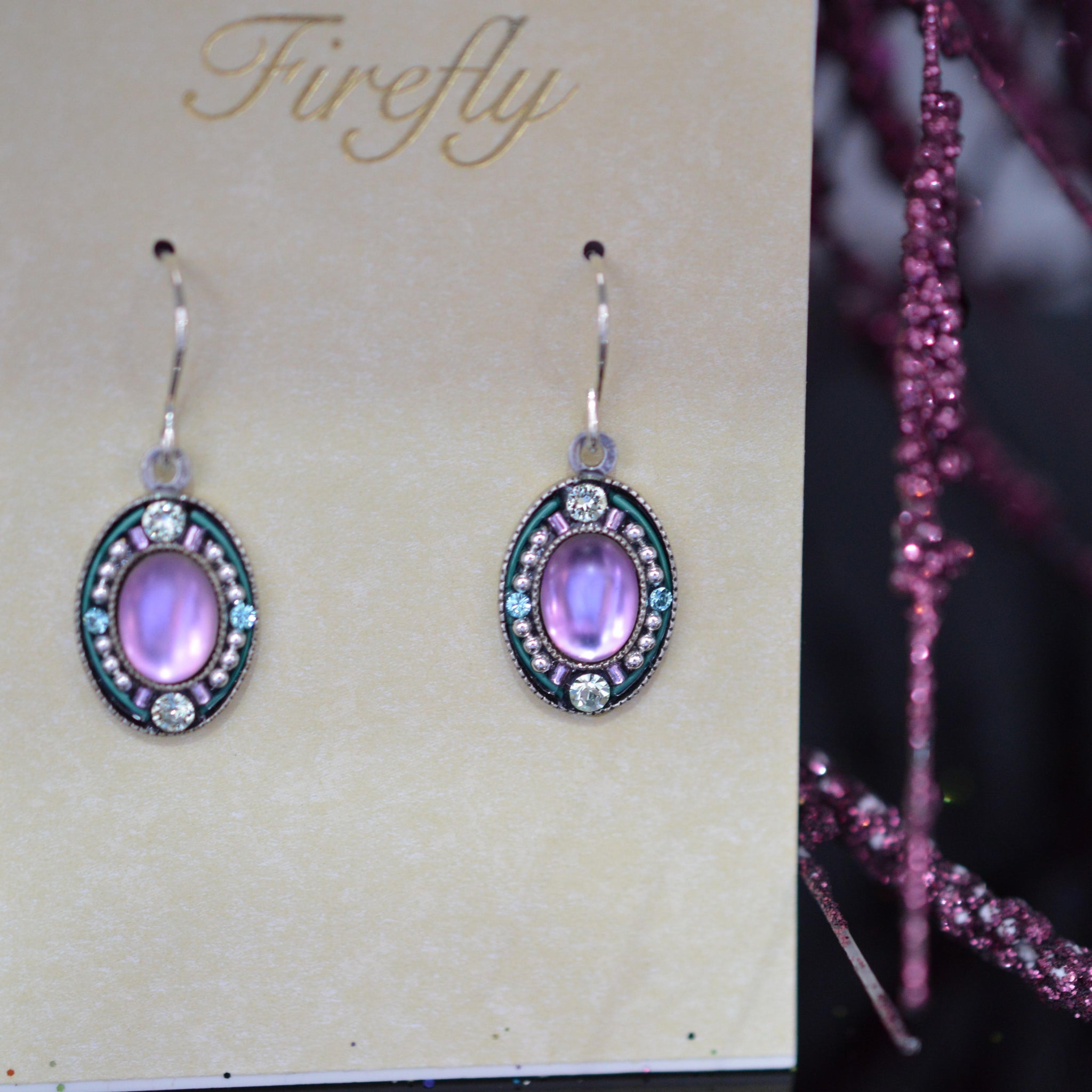 A Ladies Pair Of Antique Silver Plate 1 Inch Long (Including French Wires) Dangle Earrings By Firefly Featuring Medium Oval Soft Pink Moonlight Crystals.
