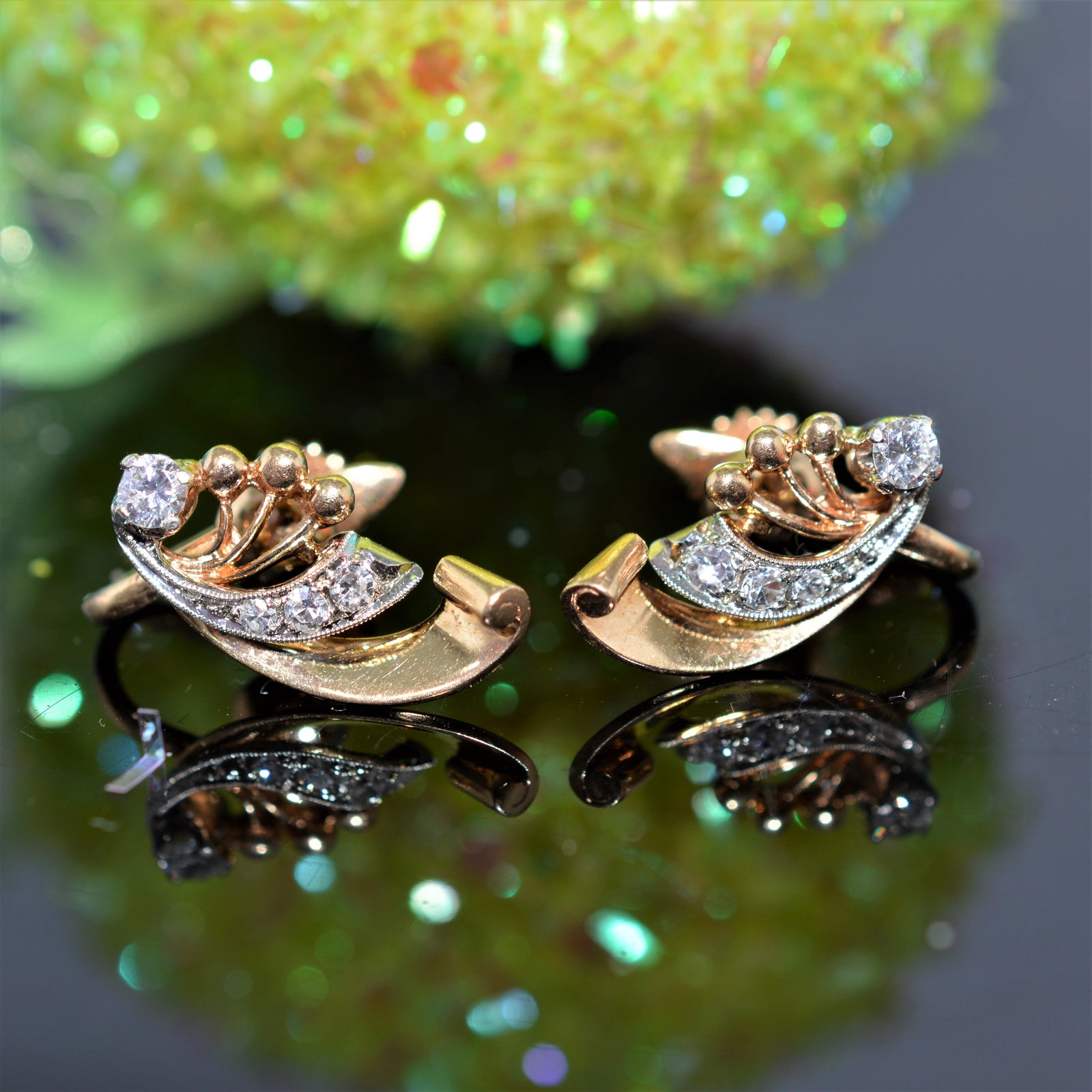 14K Two Tone Gold Vintage Non-Pierced Diamond Earrings