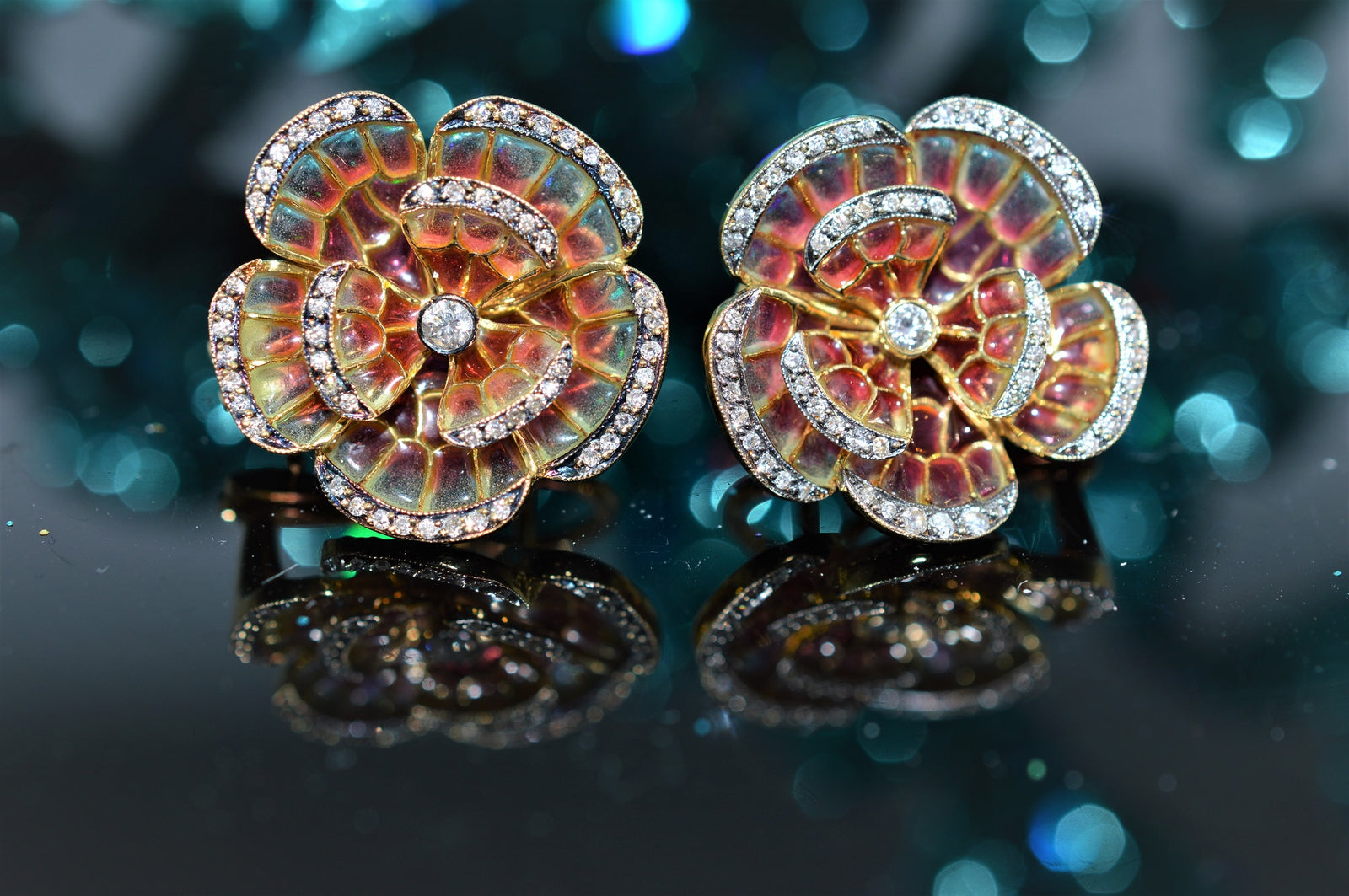18K Yellow Gold Plique-A-Jour Flower Diamond Earrings