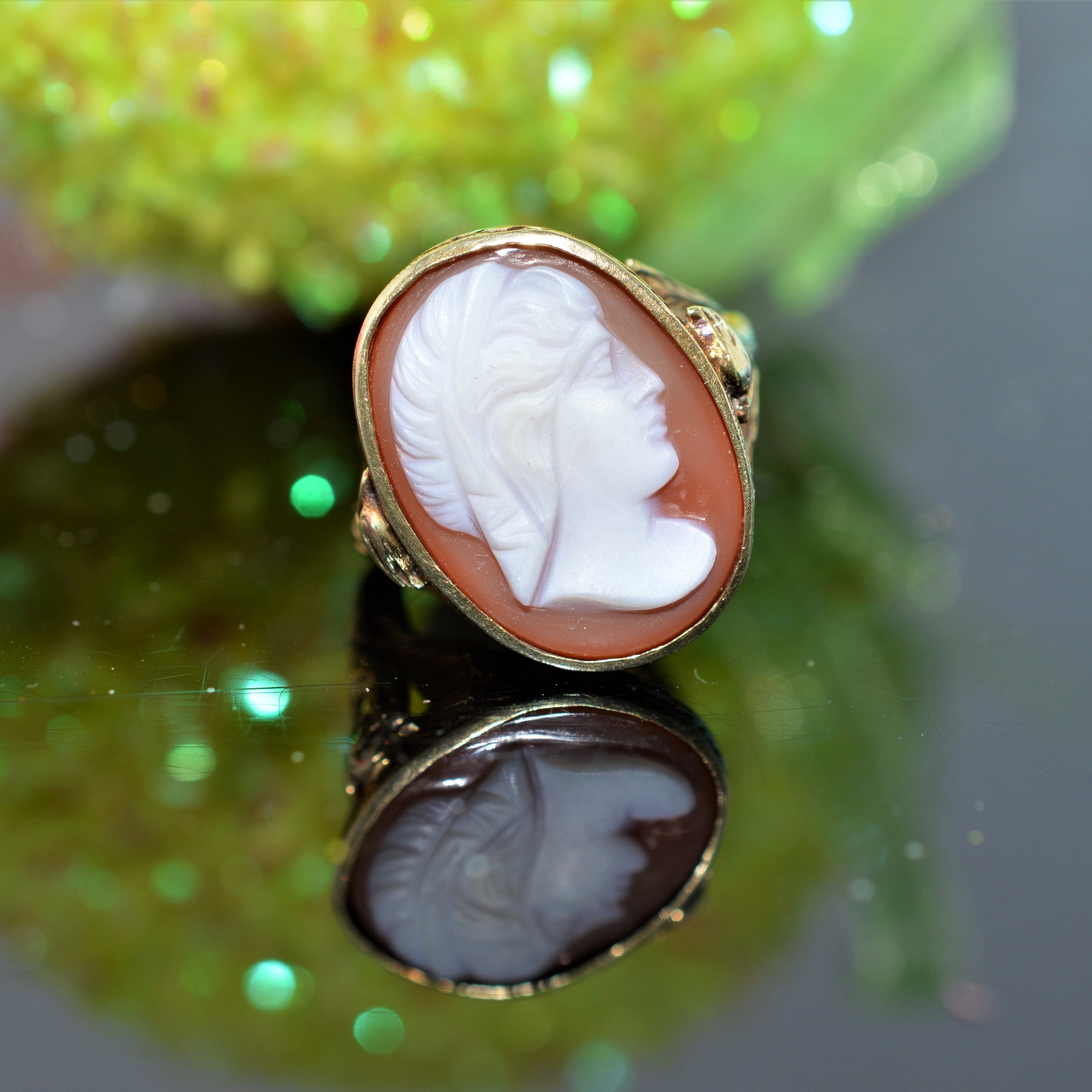 $650.00 USD14K Yellow Gold Oval Shell Cameo Ring with Phoenix on Sides