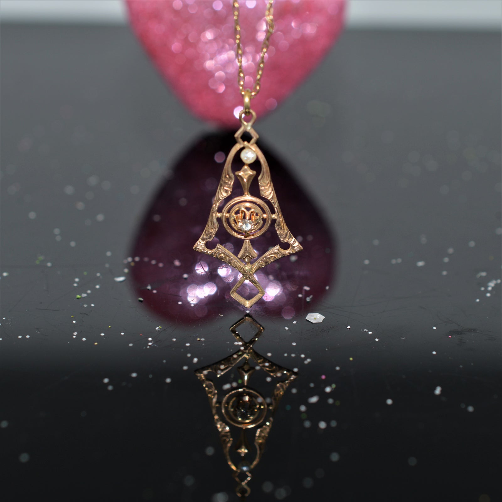$295.00 USD14K Yellow Gold Antique Diamond and Pearl Lavalier Necklace