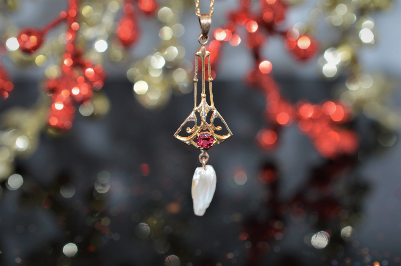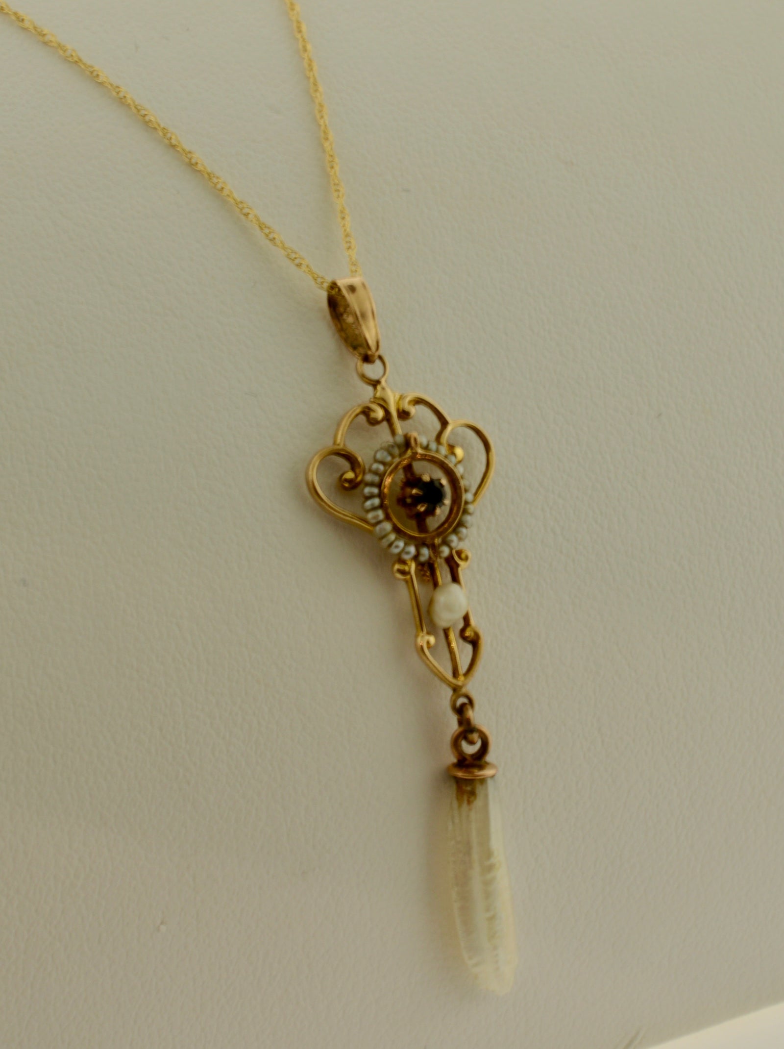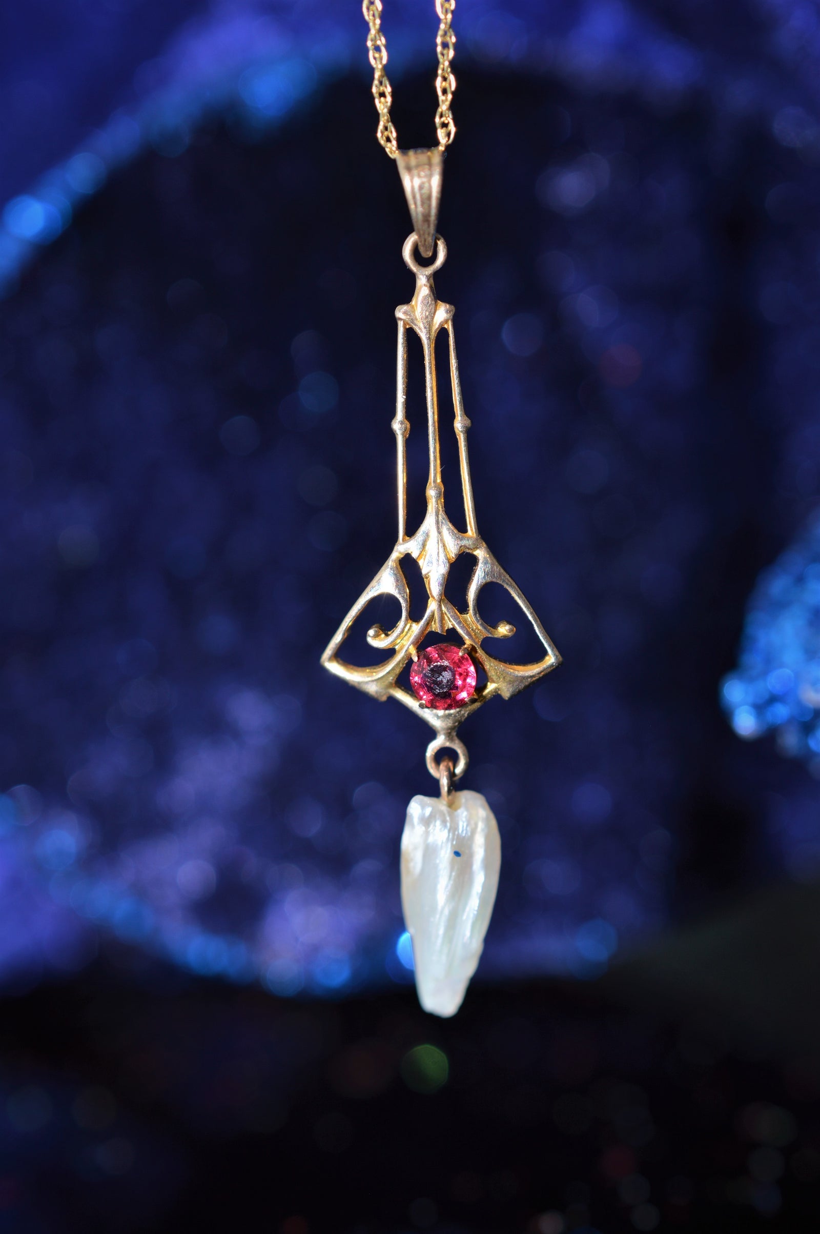 $250.00 USD10K Antique Synthetic Red Stone and Pearl Lavalier Necklace