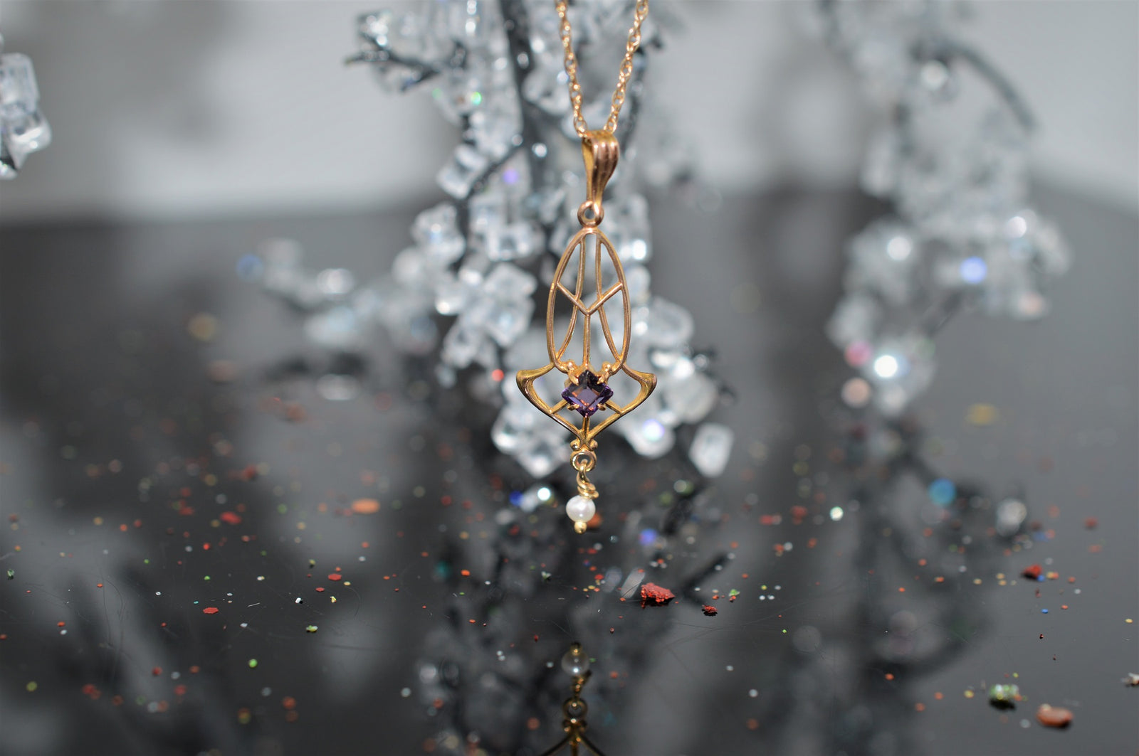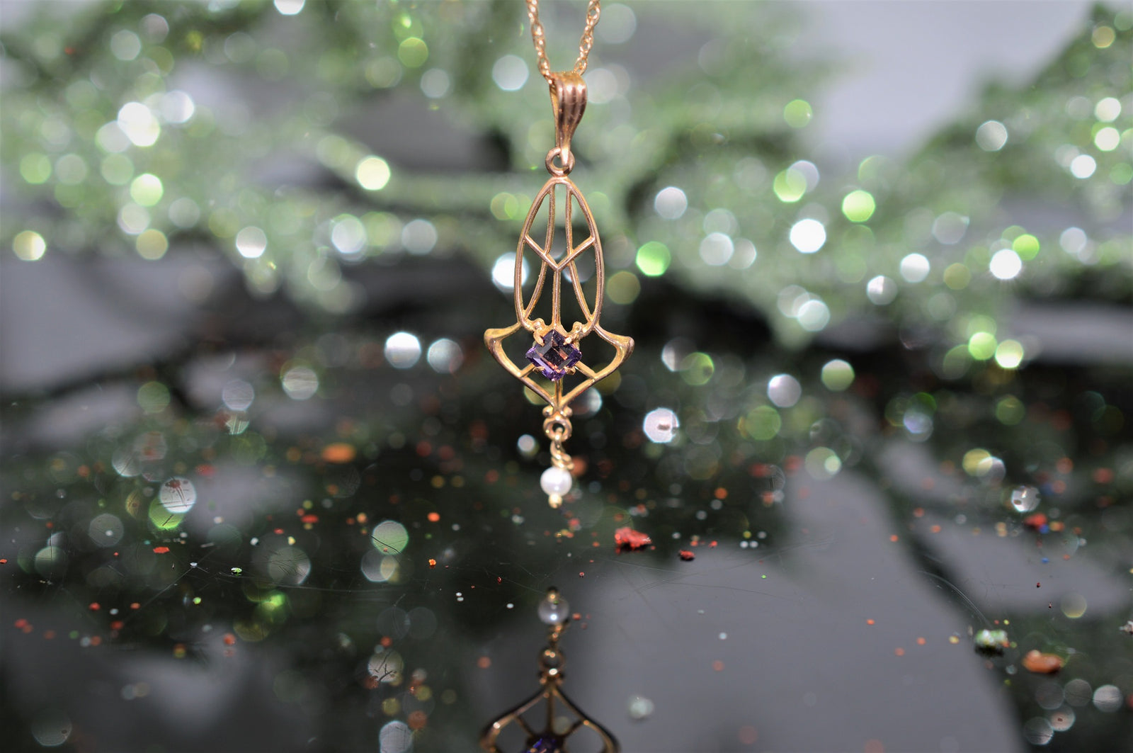 $225.00 USD14K Yellow Gold Antique Amethyst and Pearl Lavalier Necklace