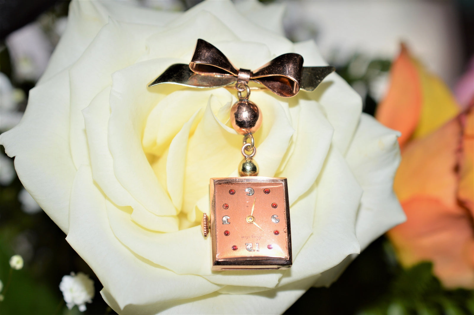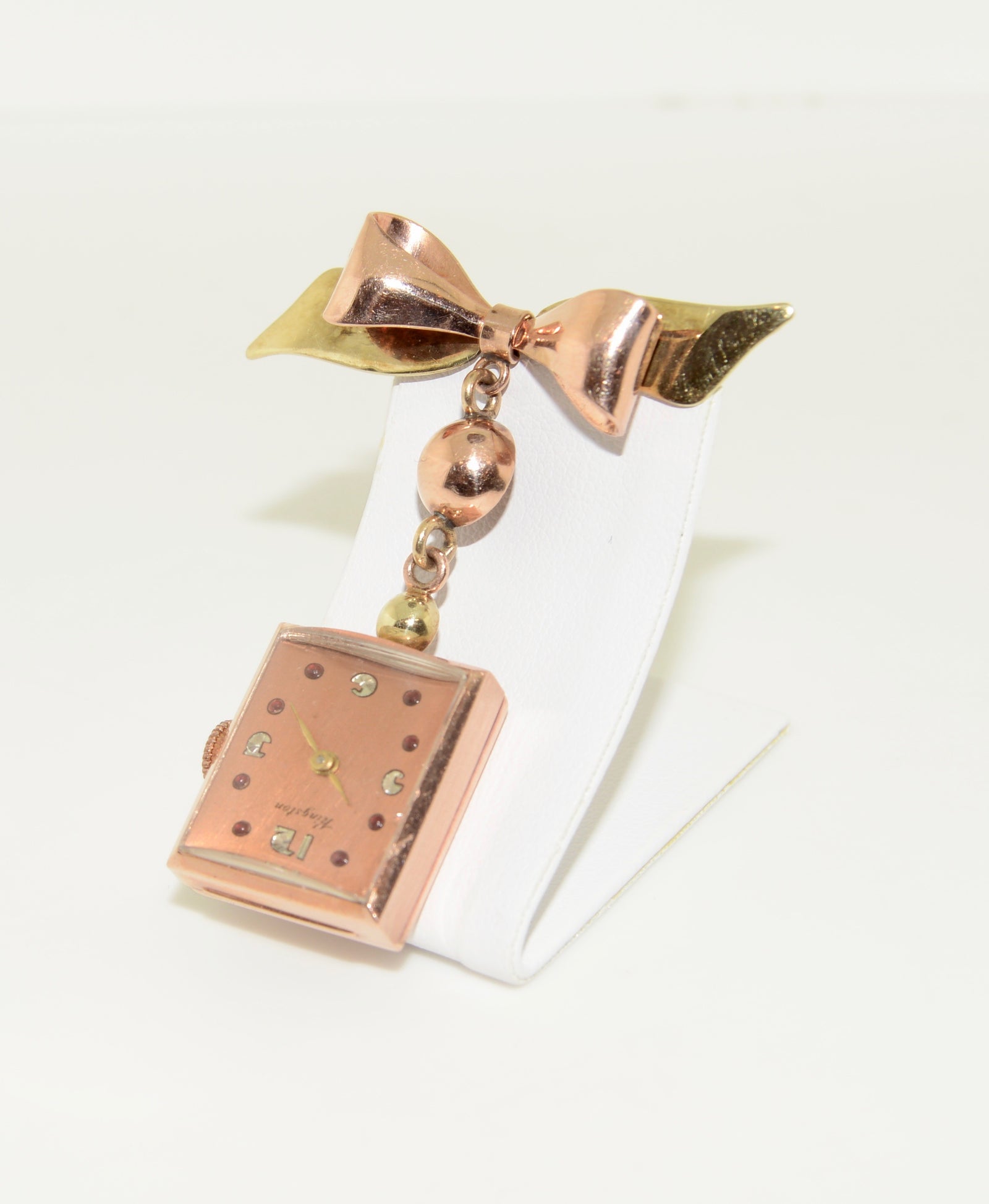 Pink and Yellow Gold Retro Bow Lapel Watch by Kingston