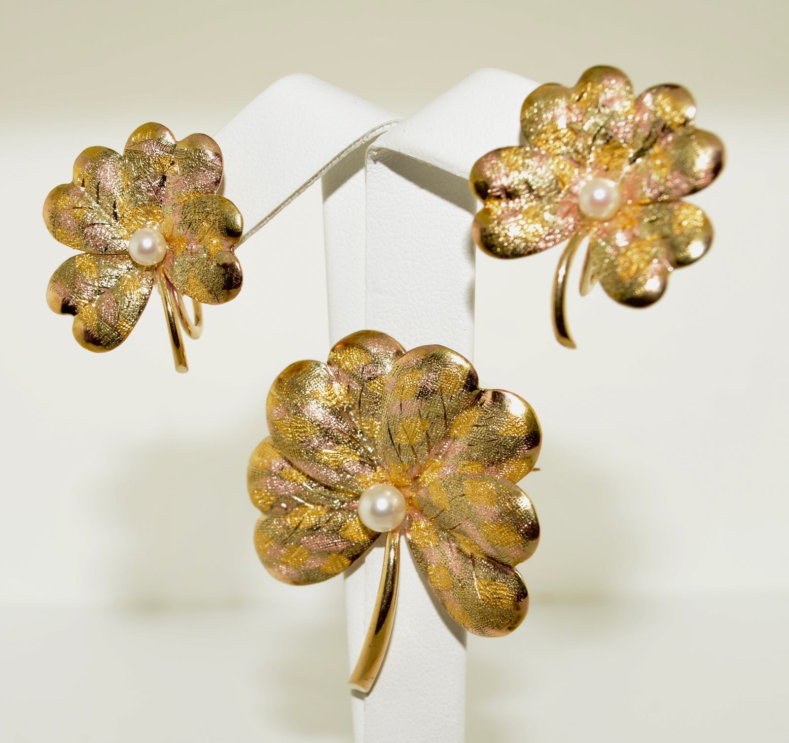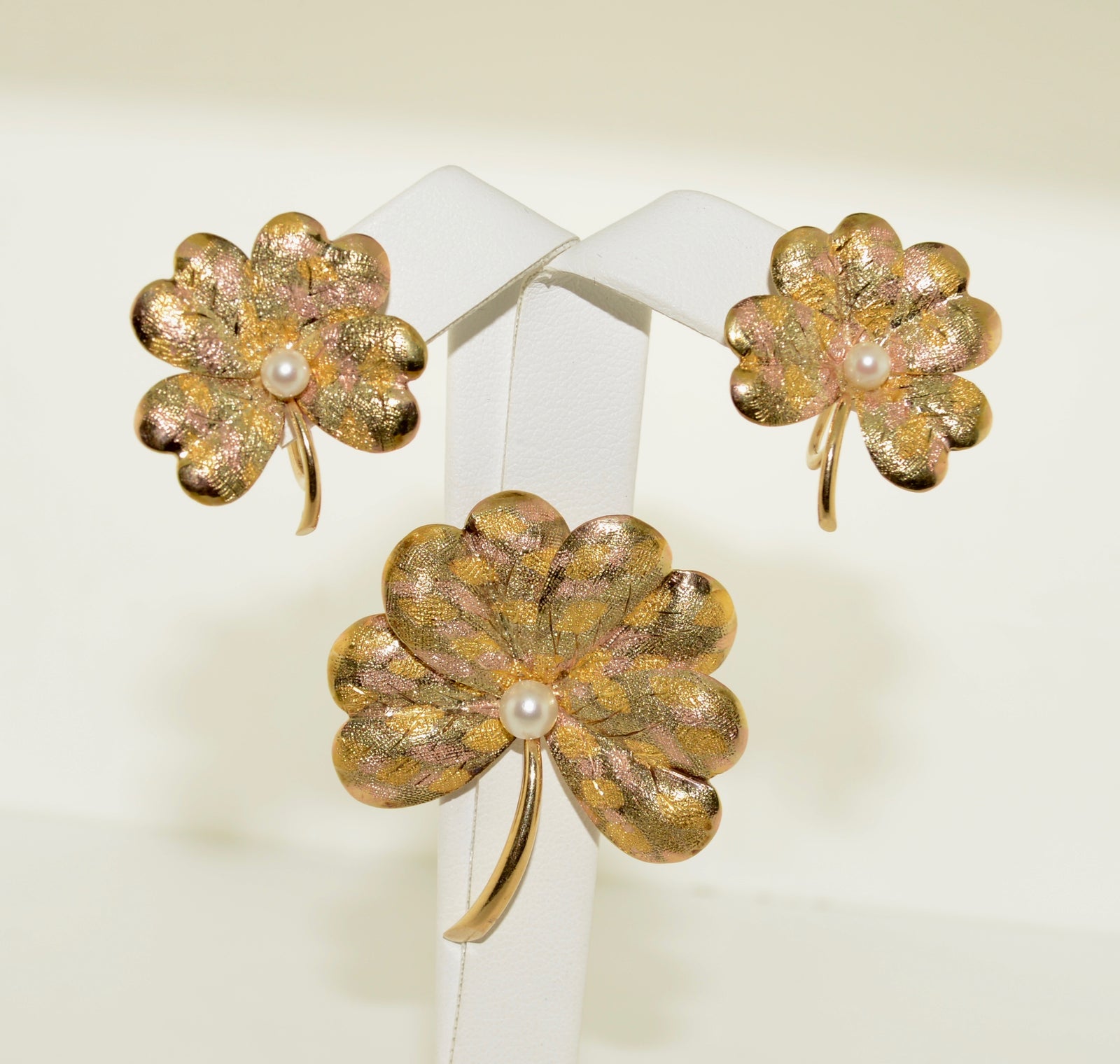 $595.00 USDTri-Color Shamrock and Pearl Brooch and Earring Set