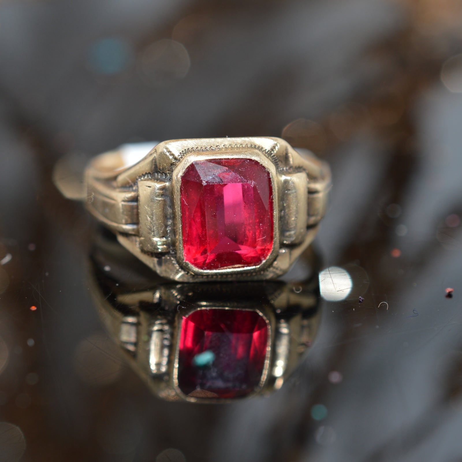 $750.00 USD10K Yellow Gold Synthetic Ruby Ring by Ostby & Barton