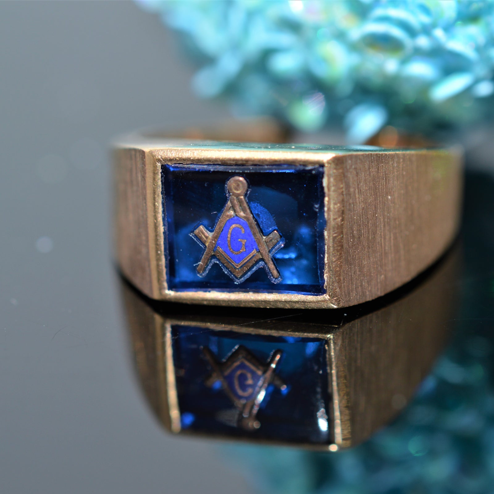 $700.00 USD10k Yellow Gold Solid Back Masonic Blue Spinel Ring