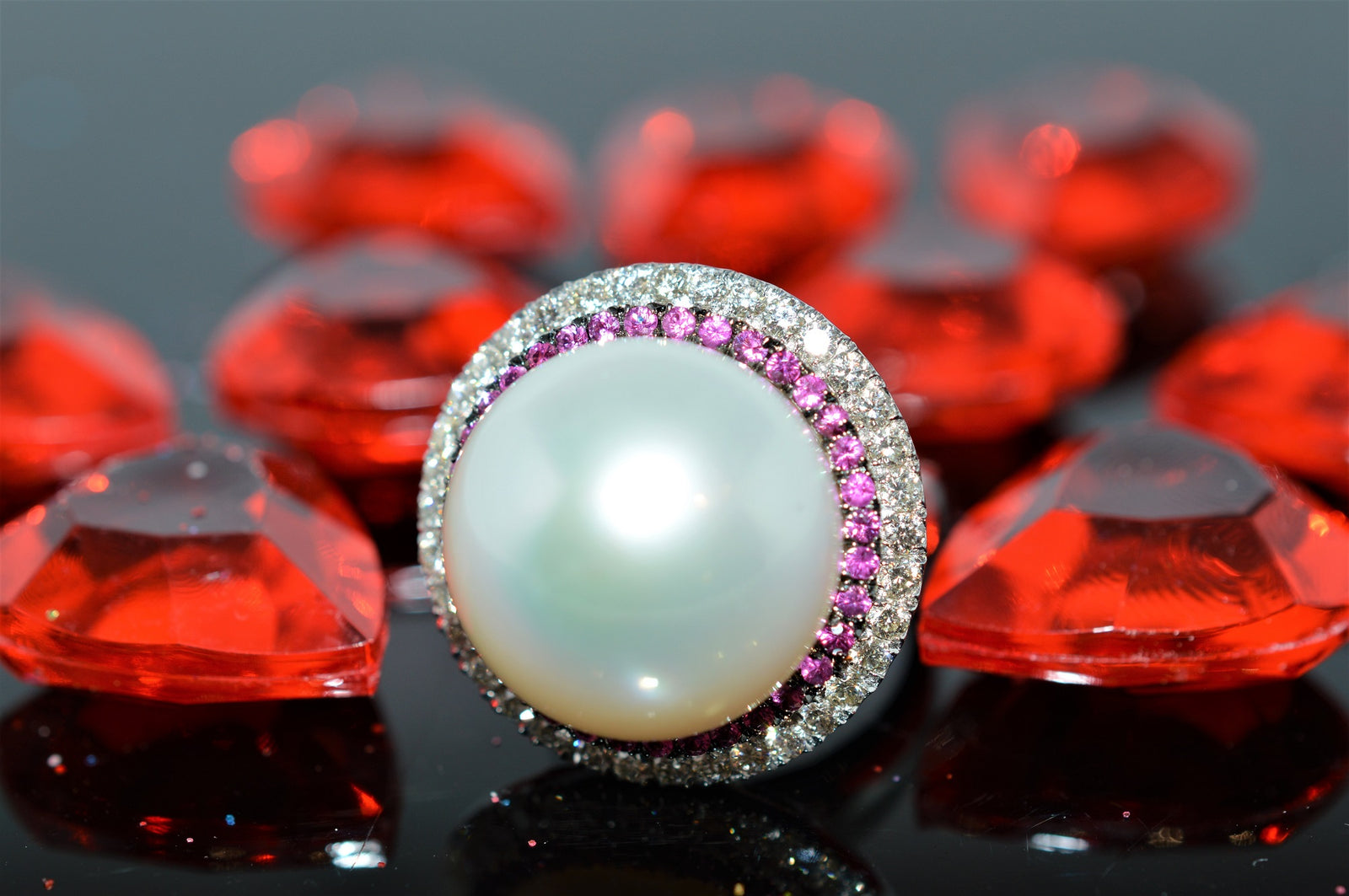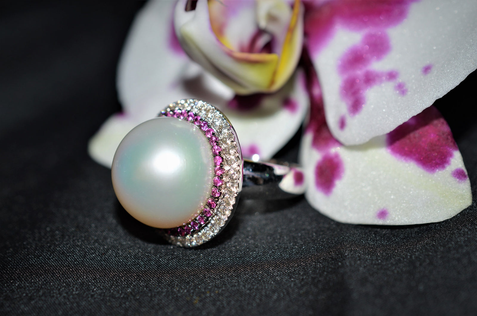 $2,295.00 USD18K White Gold Button Pearl, Diamond, and Ruby Ring
