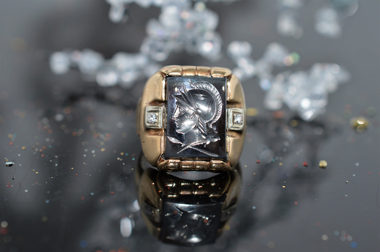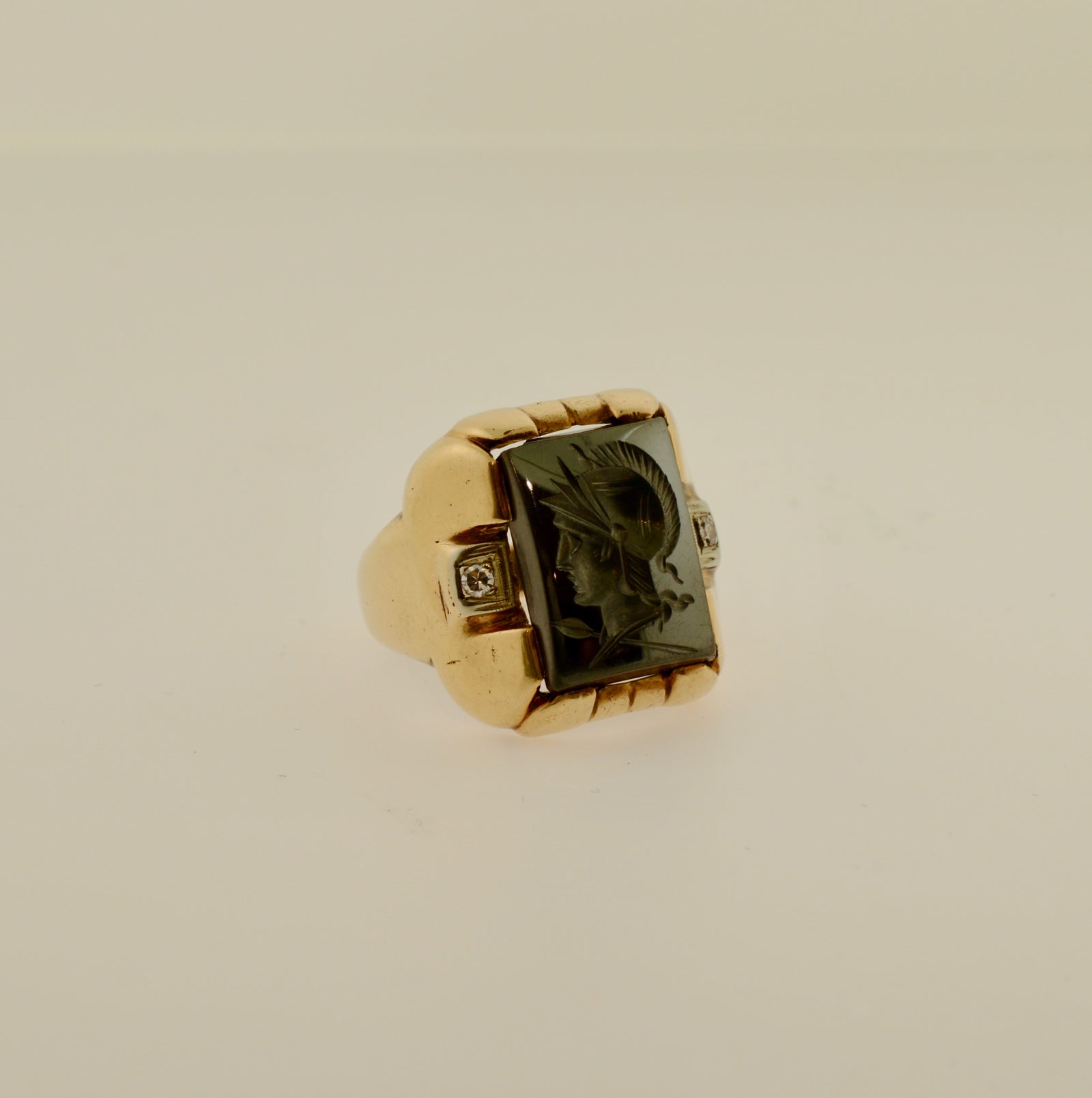 $1,995.00 USD10 Karat Men's Hematite Intaglio and Diamond Gold Ring