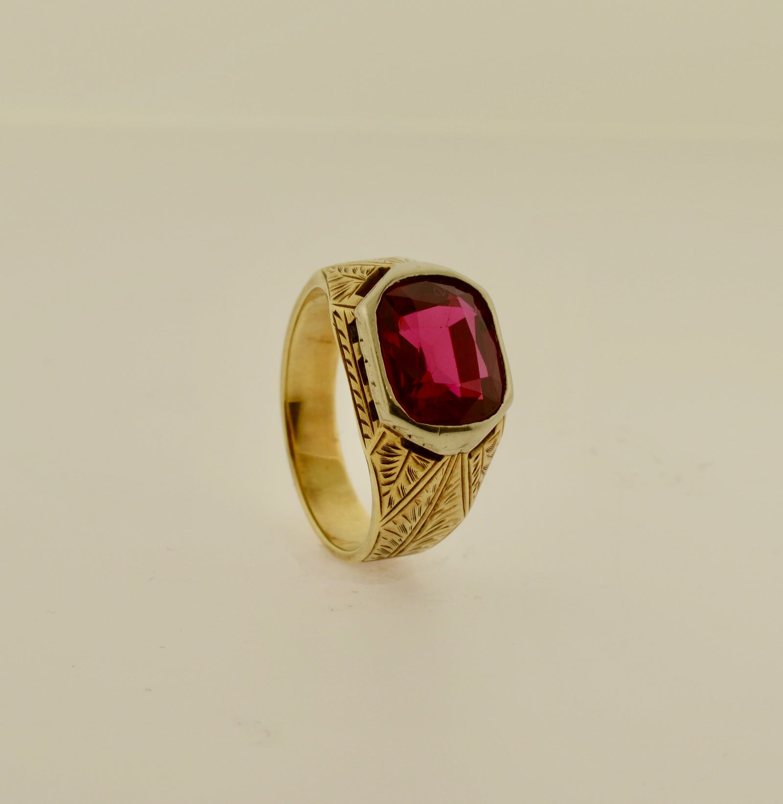 $550.00 USDMen's 18K Two Tone Engraved Ring with Synthetic Ruby