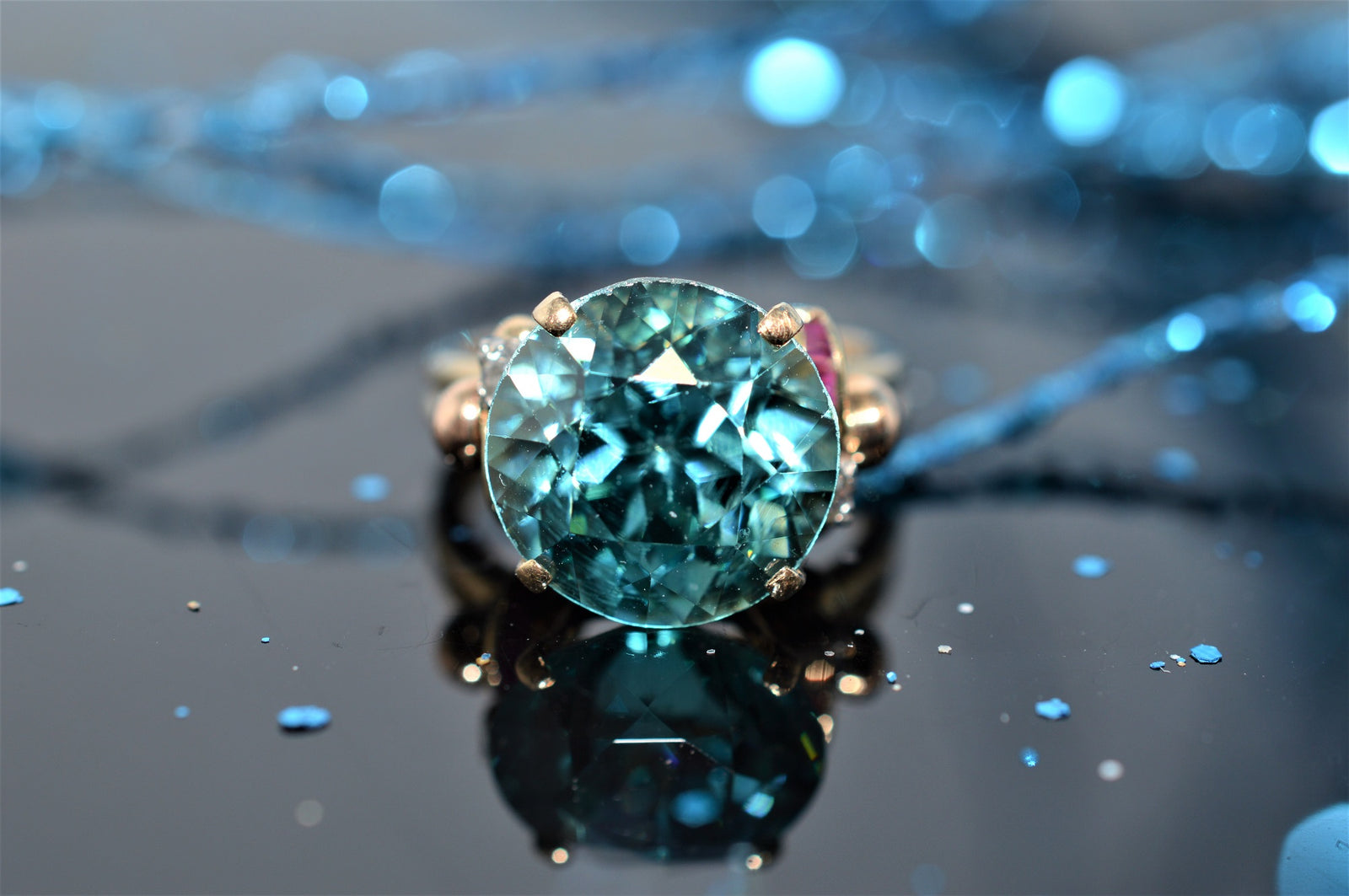 14K Yellow and Rose Gold Blue Zircon, Ruby, and Diamond Ring