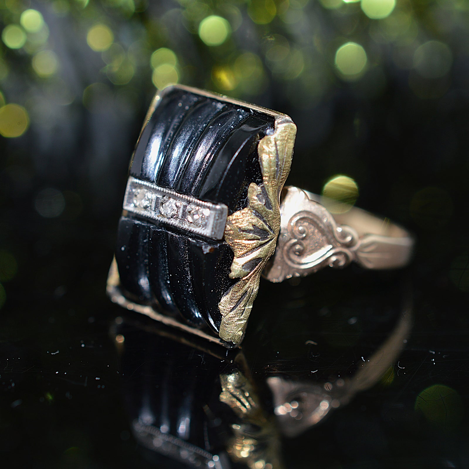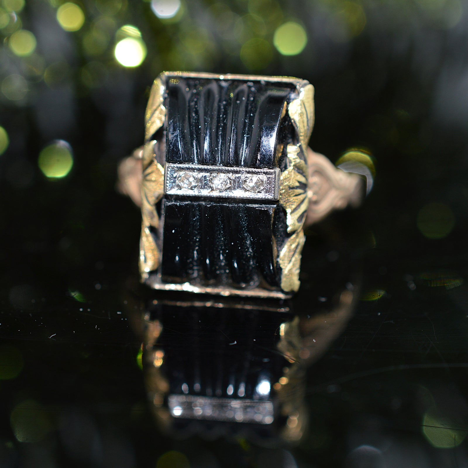 $1,100.00 USD10K Yellow Gold Diamond and Carved Black Onyx Gold Ring