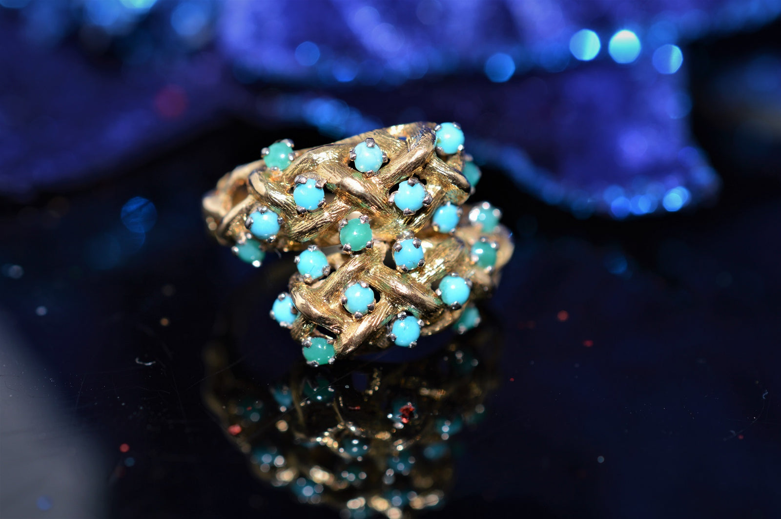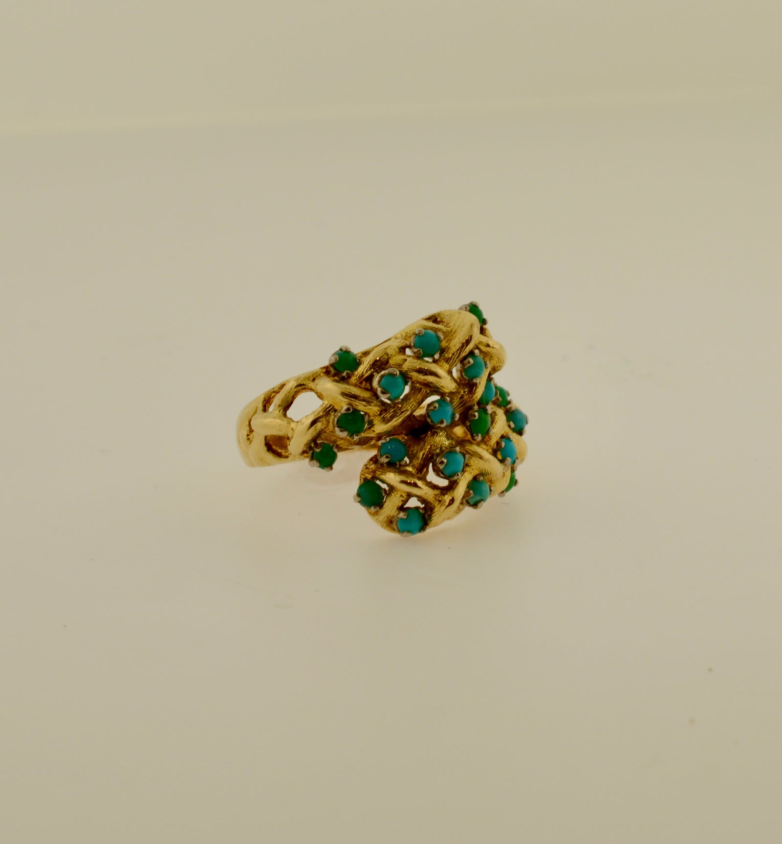 $1,250.00 USD18K Yellow Gold Woven Bypass Ring with 20 Turquoise Stones
