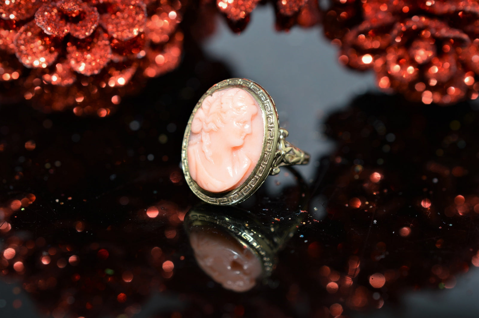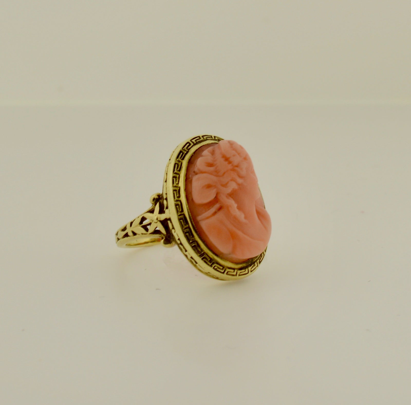 $925.00 USD14K Vintage Green Gold Ring Set With 12x16mm Pink Cameo