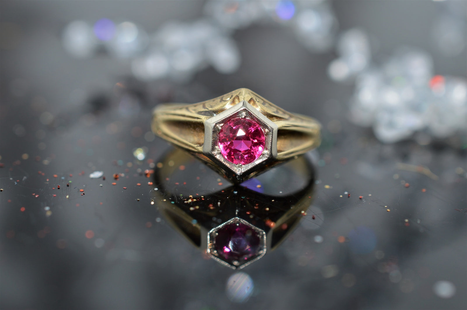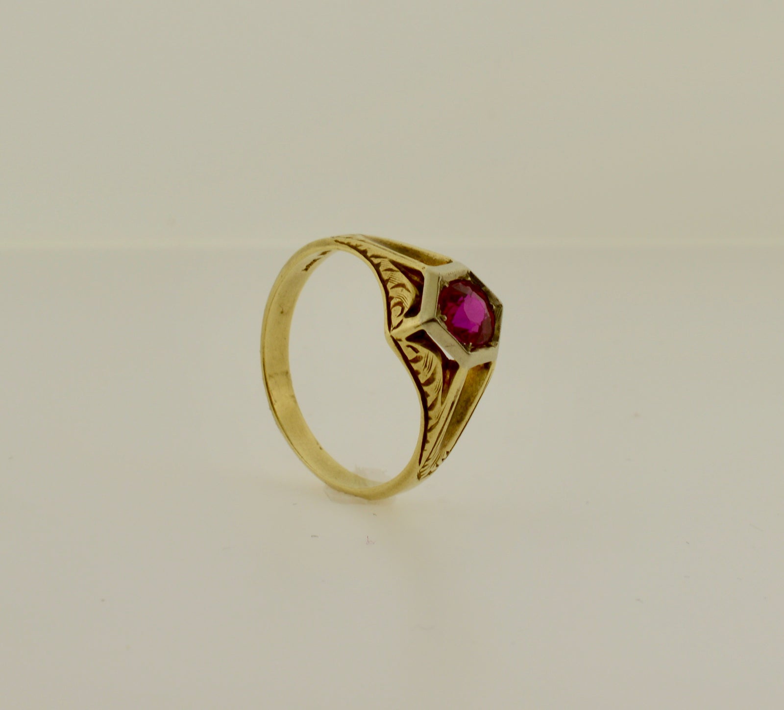 $675.00 USD18K & 14K Yellow and White Gold Vintage Synthetic Ruby Ring
