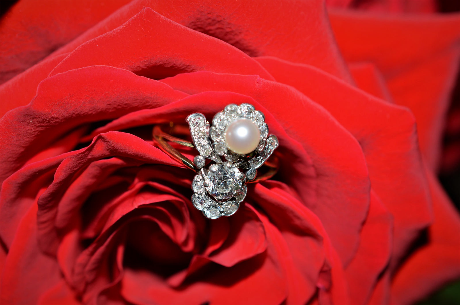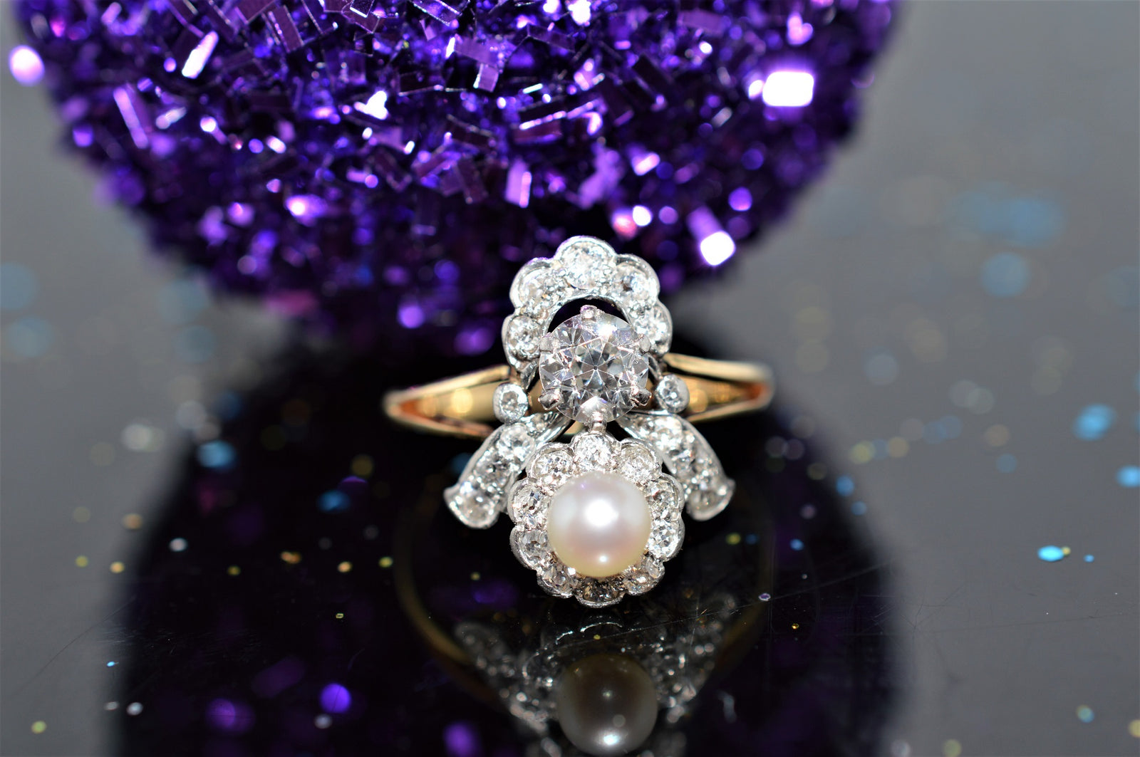 14K Two Tone Antique Krementz Pearl and Diamond Ring
