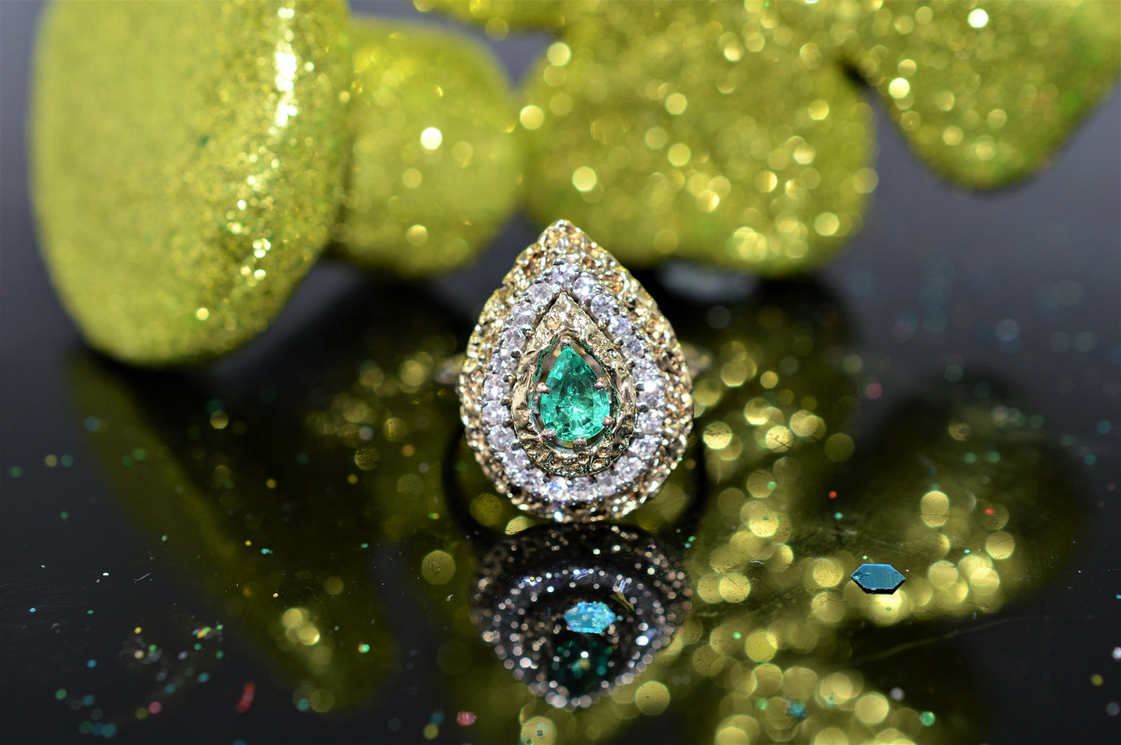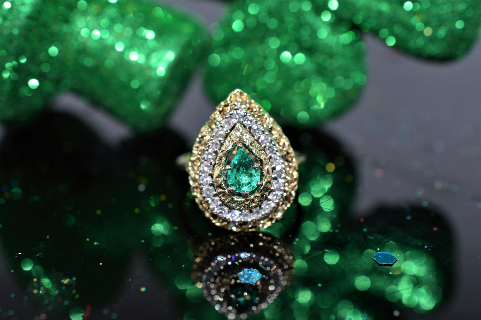 $2,950.00 USD14K Yellow Gold, Teardrop Emerald Gold Nugget Design Ring