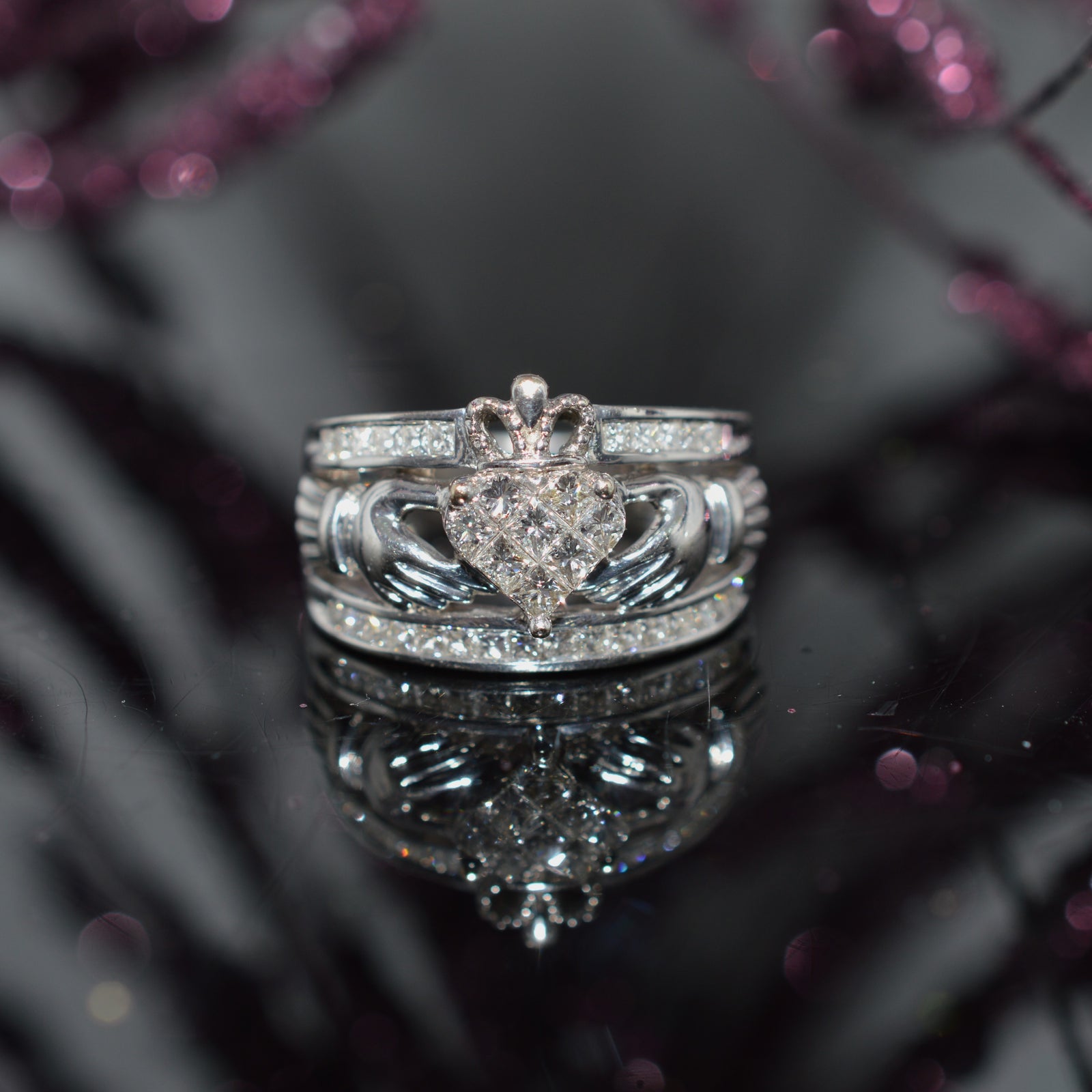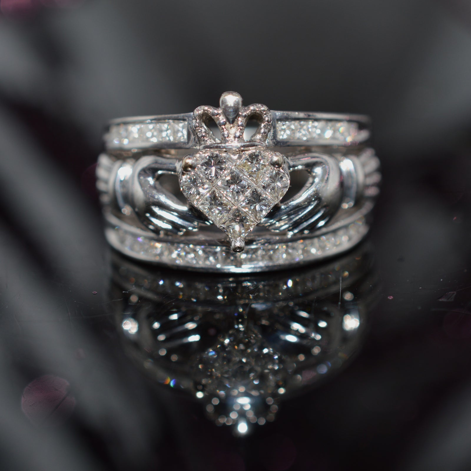 $525.00 USD18K White Gold Claddagh 1.00 Carat Total Weight Diamond Ring