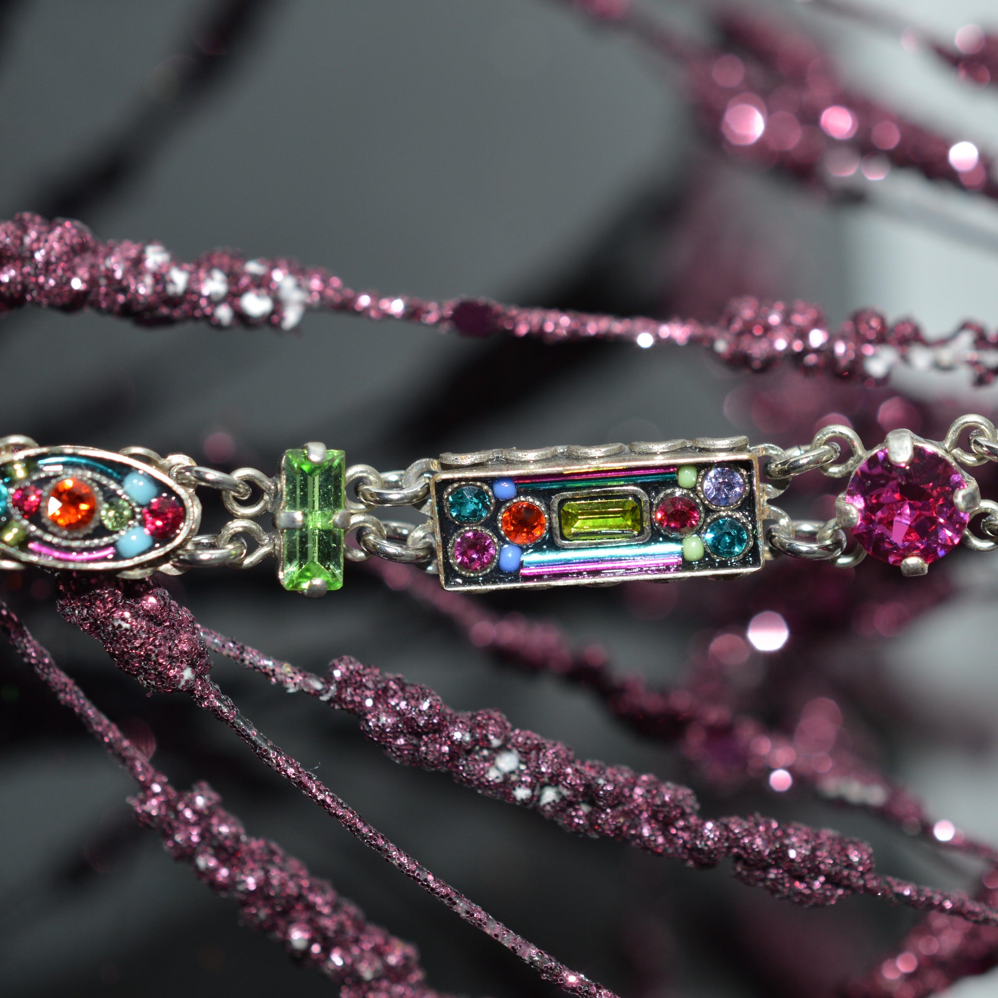 A Ladies Antique Silver Plate 7-8 Inch Long Adjustable Bracelet By Firefly Featuring Multi-Color Swarovski Crystals In An Architectural Design.