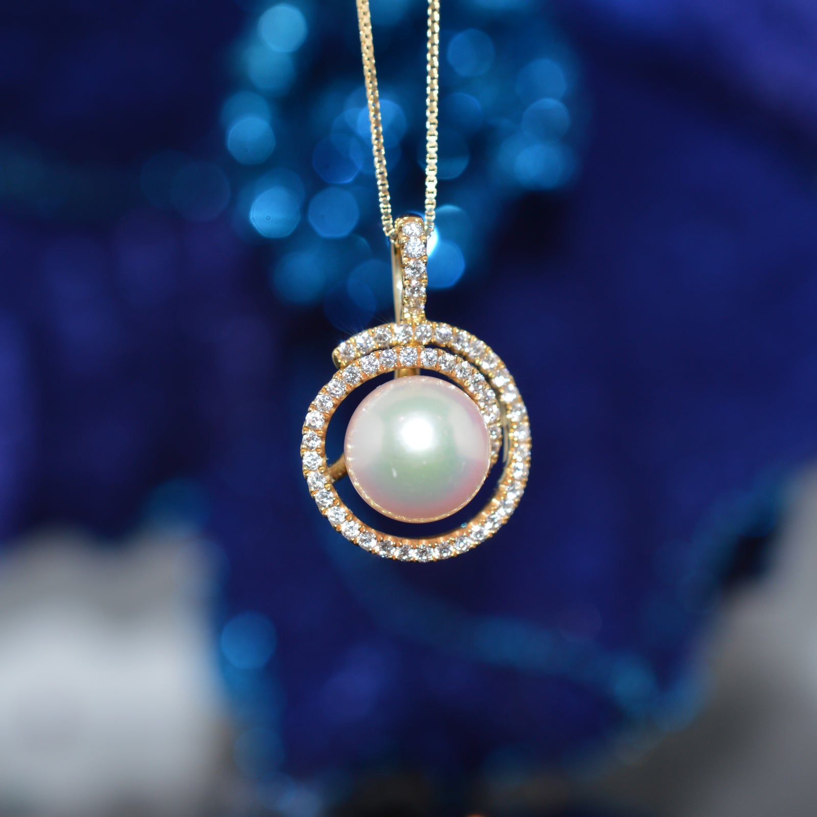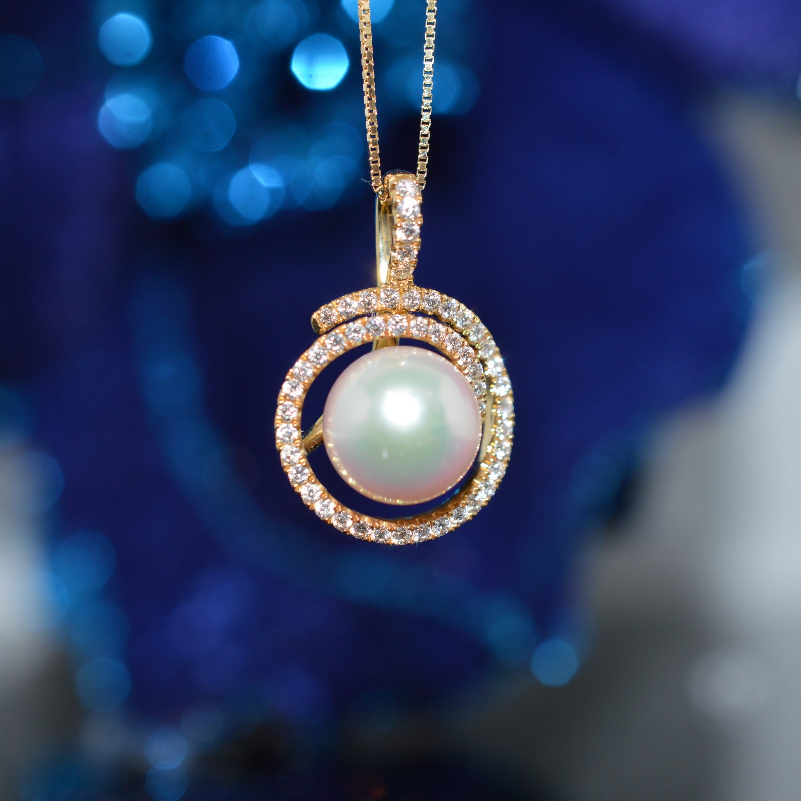 $2,150.00 USD18K Yellow Gold Pearl Pendant With Diamond Halo And 18K Chain