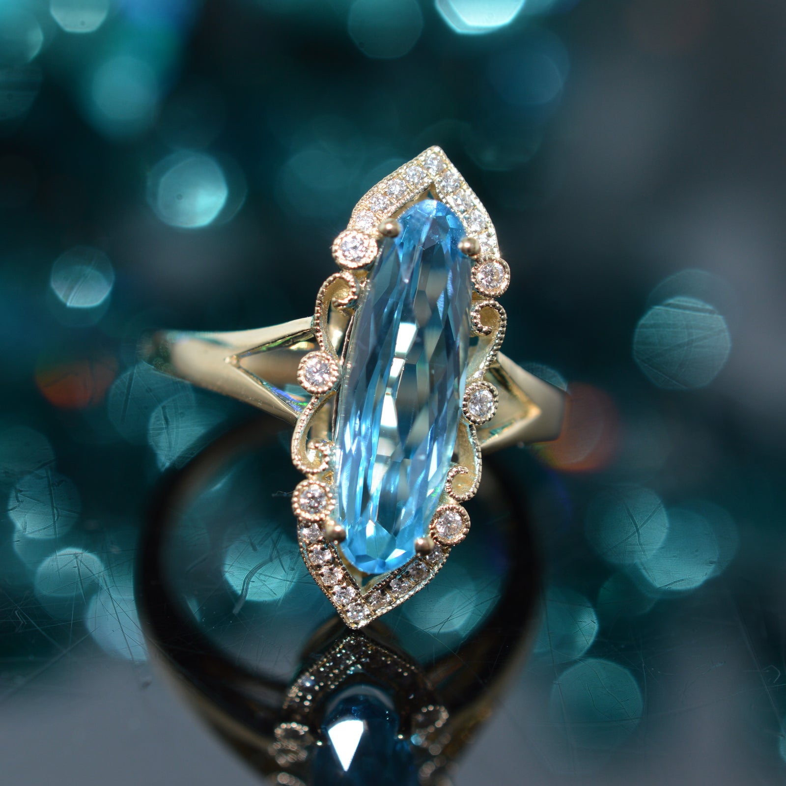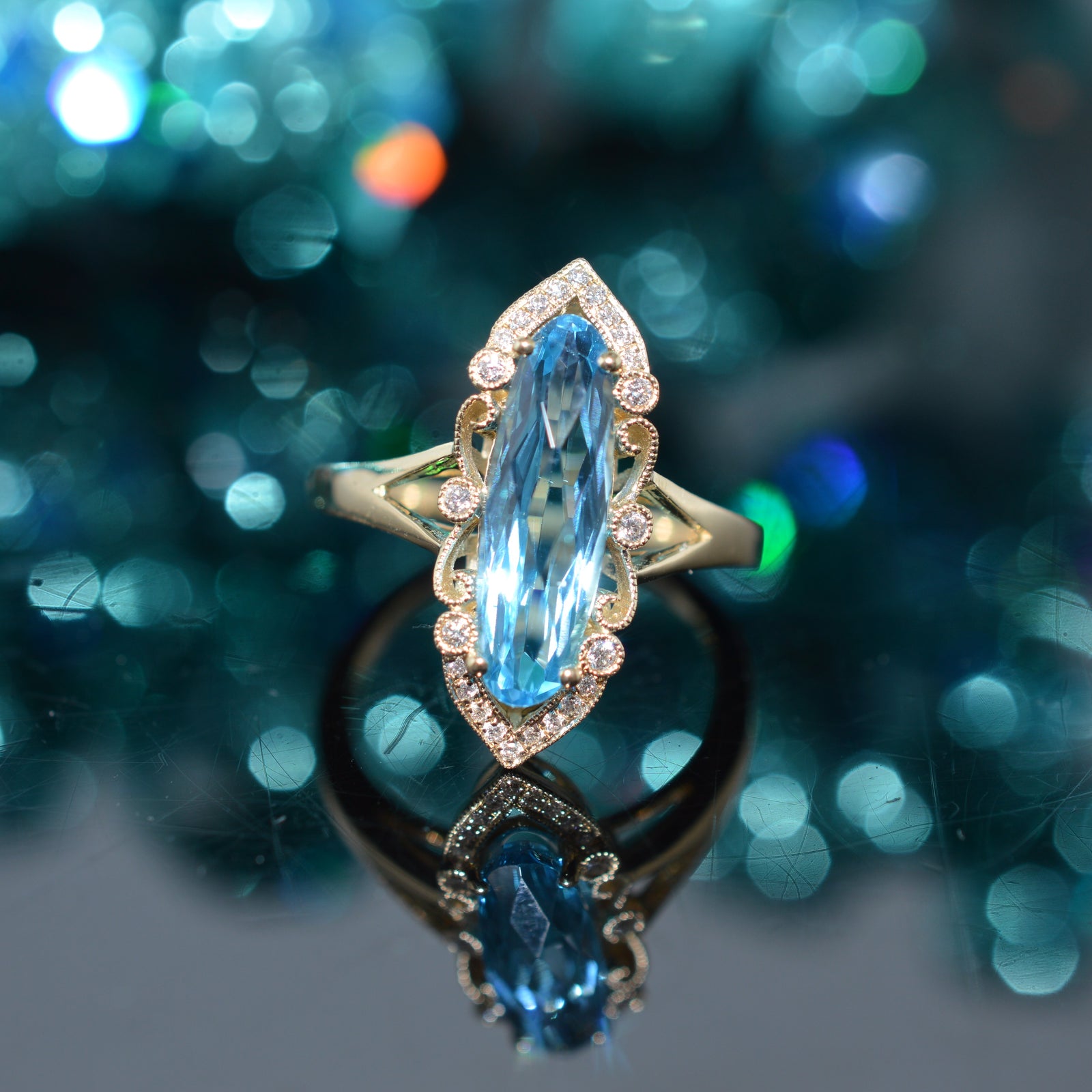 $1,300.00 USD14K Yellow Gold Elongated Oval Blue Topaz & Diamond Ring