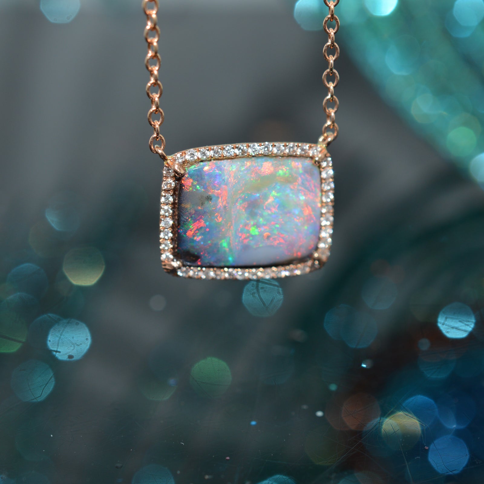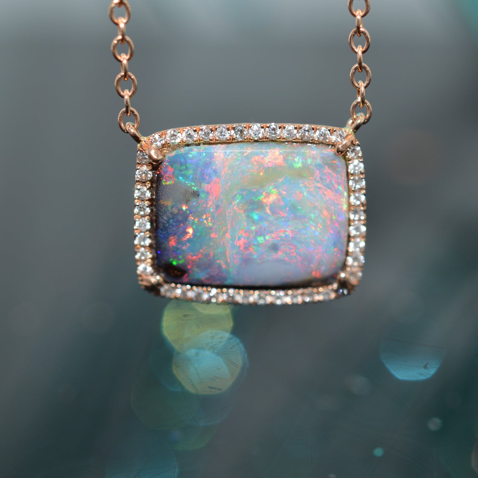 $650.00 USD14K Rose Gold 3.33 Carat Boulder Opal & Diamond Pendant on 14K Chain