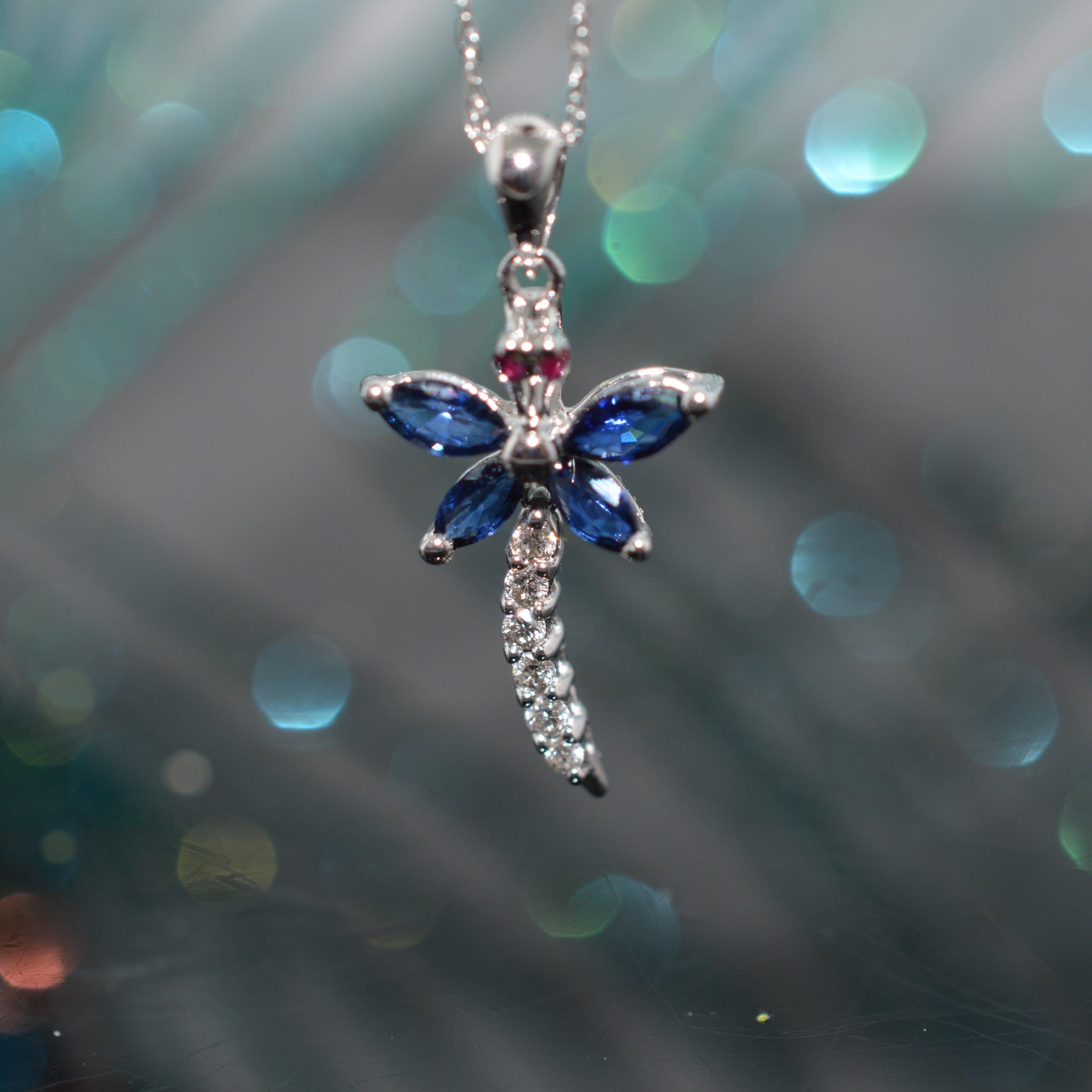 A Ladies 14K White Gold 18 Inch Long Chain With A 14K White Gold Dragonfly Pendant Set With 4 Marquise Cut Sapphires, 2 Round Ruby Eyes, And 6 Round Diamonds Having A Total Weight Of .08 Carats.