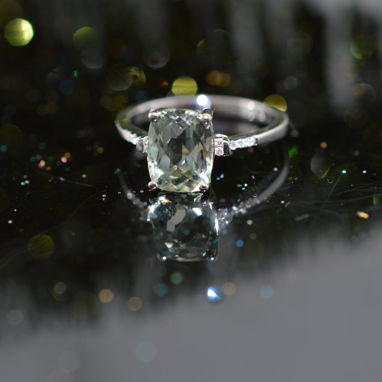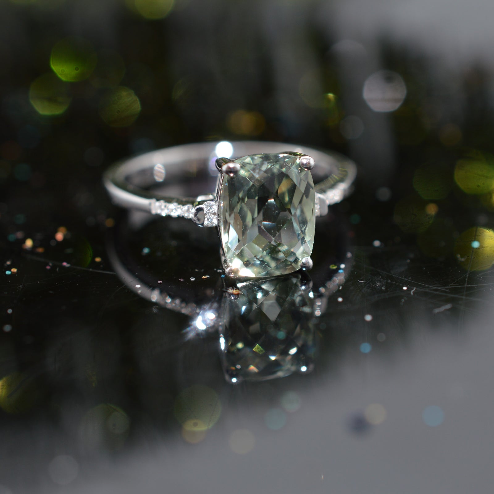 $425.00 USD14K White Gold Checkerboard Cushion Cut Green Amethyst And Diamond Ring