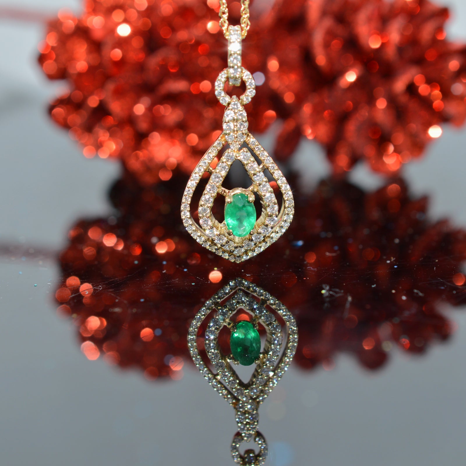 $890.00 USD14K Yellow Gold Genuine Emerald And Diamond Pendant With Chain
