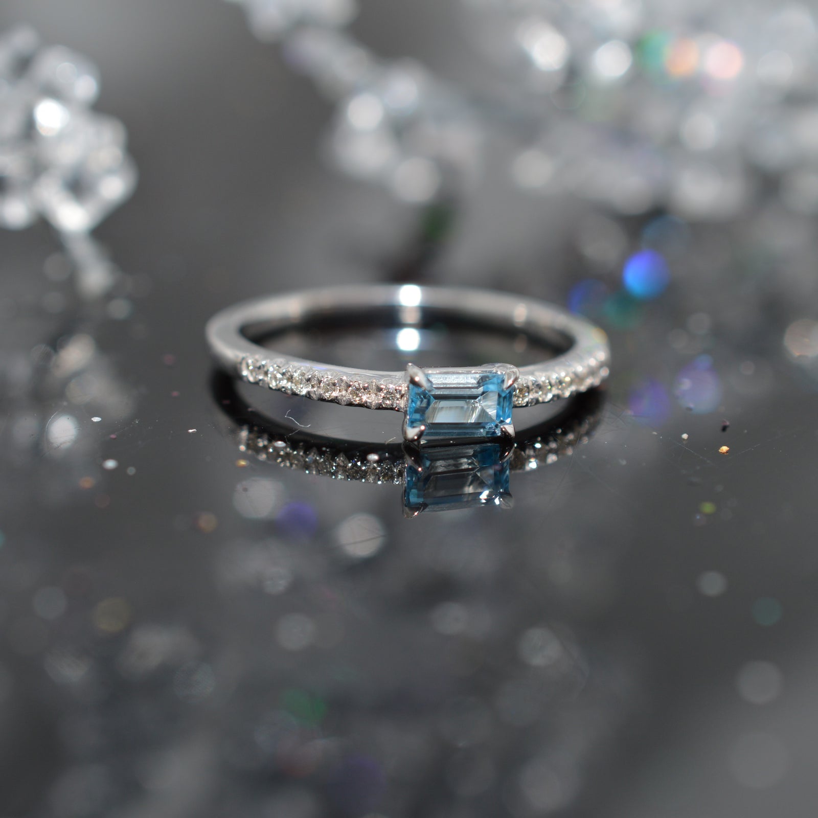 $425.00 USD10K White Gold Sideways Set Emerald-Cut Blue Topaz And Diamond Stackable Ring